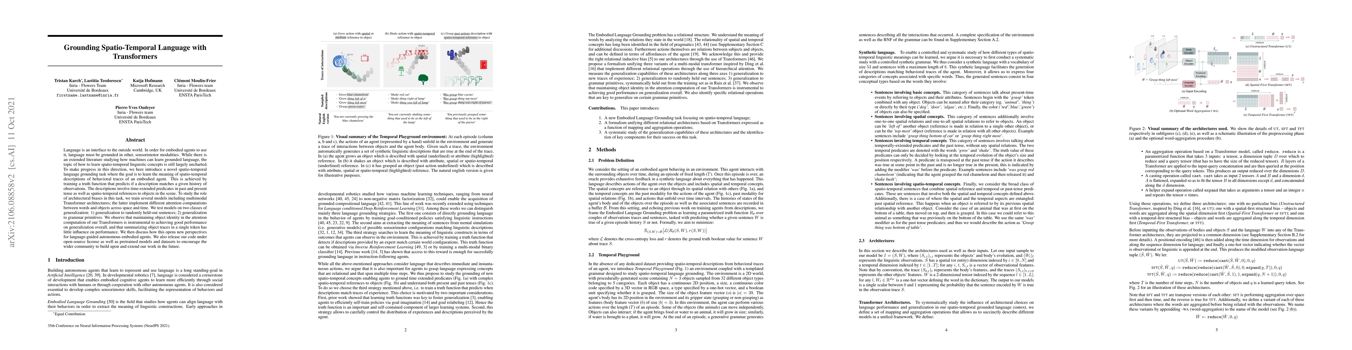 The paper introduces a novel spatio-temporal language grounding task, training a truth function to predict if a description matches a given history of observations. Multimodal Transformer architectures are employed, implementing various attention computations between words and objects across space and time.