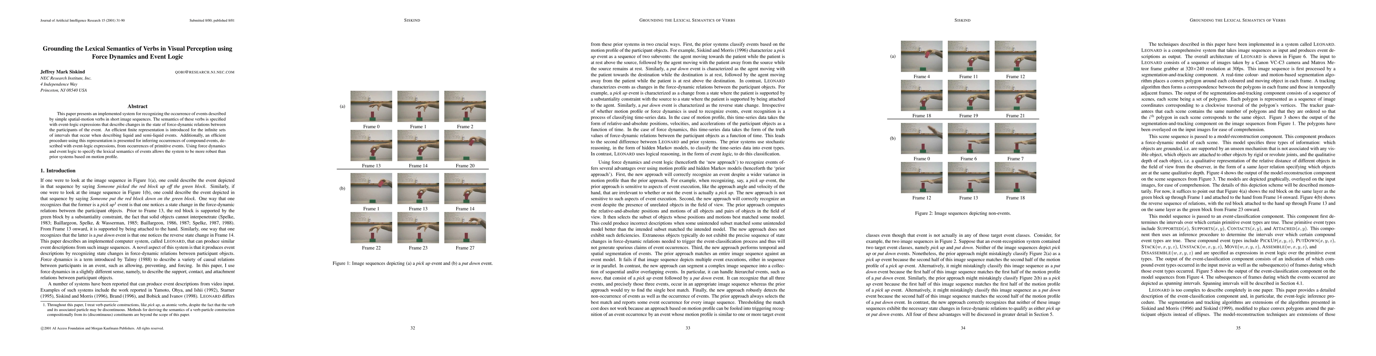 This paper presents an implemented system for recognizing the occurrence of events described by simple spatial-motion verbs in short image sequences. The semantics of these verbs is specified with event-logic expressions that describe changes in the state of force-dynamic relations between the participants of the event. An efficient finite representation is introduced for the infinite sets of intervals that occur when describing liquid and semi-liquid events. Additionally, an efficient procedure using this representation is presented for inferring occurrences of compound events, described with event-logic expressions, from occurrences of primitive events. Using force dynamics and event logic to specify the lexical semantics of events allows the system to be more robust than prior systems based on motion profile.