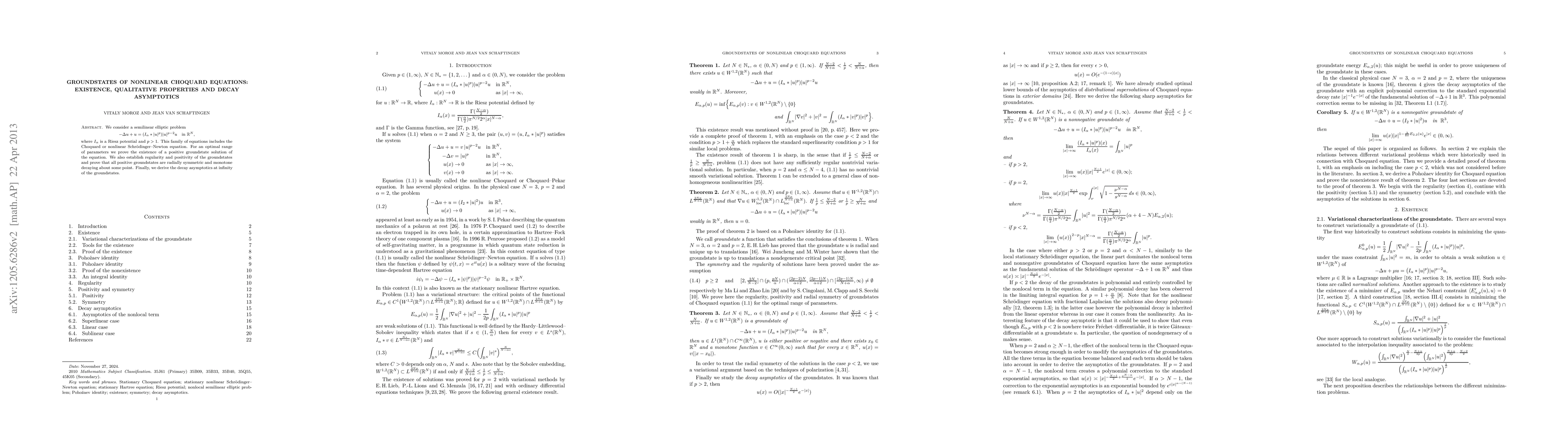 We consider a semilinear elliptic problem [- \Delta u + u = (I_\alpha \ast \abs{u}^p) \abs{u}^{p - 2} u \quad\text{in (\mathbb{R}^N),}] where (I_\alpha) is a Riesz potential and (p>1). This family of equations includes the Choquard or nonlinear Schr\"odinger-Newton equation. For an optimal range of parameters we prove the existence of a positive groundstate solution of the equation. We also establish regularity and positivity of the groundstates and prove that all positive groundstates are radially symmetric and monotone decaying about some point. Finally, we derive the decay asymptotics at infinity of the groundstates.