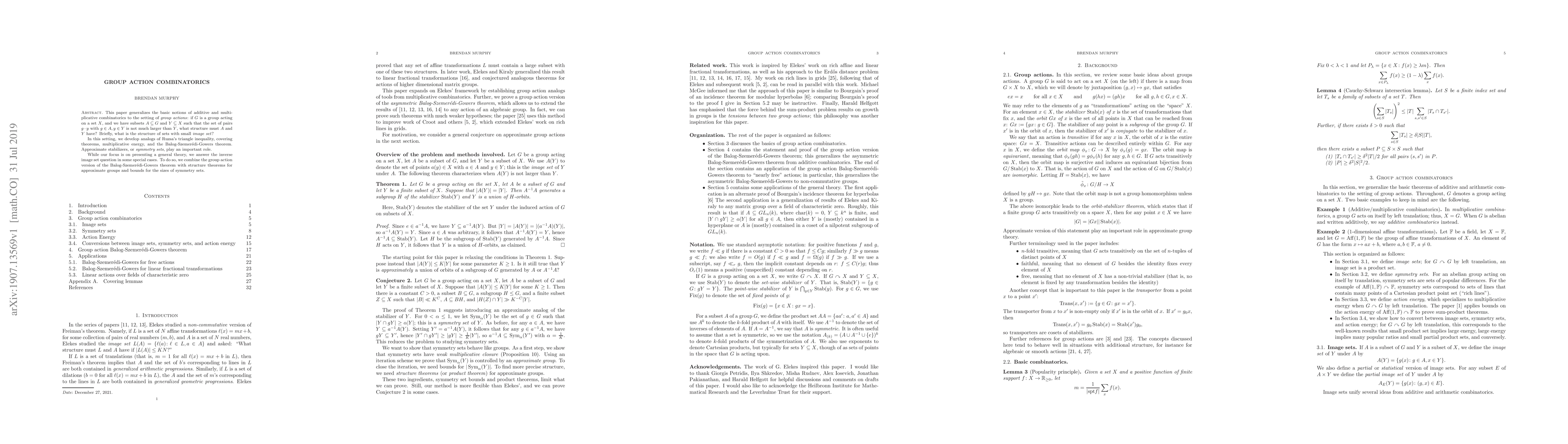 This paper generalizes the basic notions of additive and multiplicative combinatorics to the setting of group actions: if $G$ is a group acting on a set $X$, and we have subsets $A\subseteq G$ and $Y\subseteq X$ such that the set of pairs $g\cdot y$ with $g\in A,y\in Y$ is not much larger than $Y$, what structure must $A$ and $Y$ have? Briefly, what is the structure of sets with small "image set"? In this setting, we develop analogs of Ruzsa's triangle inequality, covering theorems, multiplicative energy, and the Balog-Szemer\'{e}di-Gowers theorem. Approximate stabilizers, which we call symmetry sets, play an important role. While our focus is on presenting a general theory, we answer the inverse image set question in some special cases. To do so, we combine the group action version of the Balog-Szemer\'{e}di-Gowers theorem with structure theorems for approximate groups and bounds for the sizes of symmetry sets.