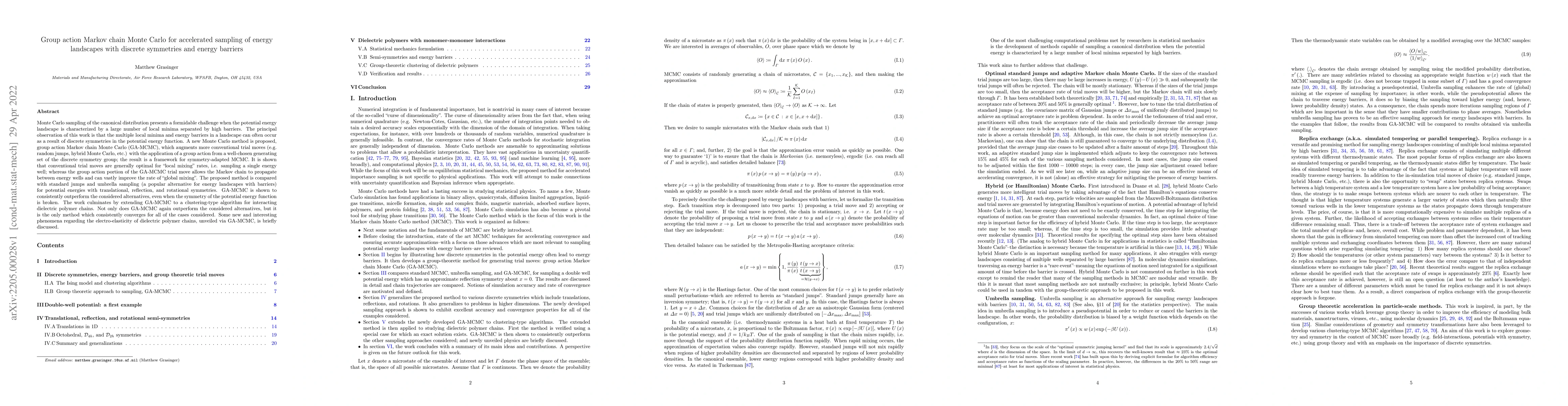Monte Carlo sampling of the canonical distribution presents a formidable challenge when the potential energy landscape is characterized by a large number of local minima separated by high barriers. The principal observation of this work is that the multiple local minima and energy barriers in a landscape can often occur as a result of discrete symmetries in the potential energy function. A new Monte Carlo method is proposed, group action Markov chain Monte Carlo (GA-MCMC), which augments more conventional trial moves (e.g. random jumps, hybrid Monte Carlo, etc.) with the application of a group action from a well-chosen generating set of the discrete symmetry group; the result is a framework for symmetry-adapted MCMC. It is shown that conventional trial moves are generally optimal for "local mixing" rates, i.e. sampling a single energy well; whereas the group action portion of the GA-MCMC trial move allows the Markov chain to propagate between energy wells and can vastly improve the rate of "global mixing". The proposed method is compared with standard jumps and umbrella sampling (a popular alternative for energy landscapes with barriers) for potential energies with translational, reflection, and rotational symmetries. GA-MCMC is shown to consistently outperform the considered alternatives, even when the symmetry of the potential energy function is broken. The work culminates by extending GA-MCMC to a clustering-type algorithm for interacting dielectric polymer chains. Not only does GA-MCMC again outperform the considered alternatives, but it is the only method which consistently converges for all of the cases considered. Some new and interesting phenomena regarding the electro-elasticity of dielectric polymer chains, unveiled via GA-MCMC, is briefly discussed.