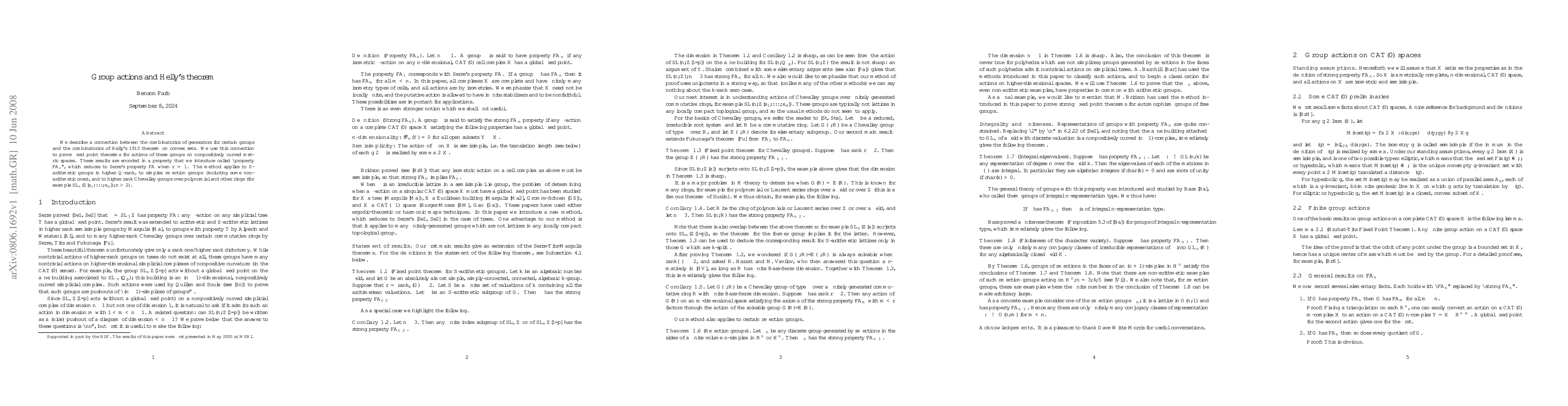This paper establishes a link between the combinatorial properties of group generators and Helly's theorem on convex sets, using this connection to prove fixed point theorems for group actions on nonpositively curved metric spaces. The results are encapsulated in a new property, "property $\FA_r$", which generalizes Serre's property $\FA$.