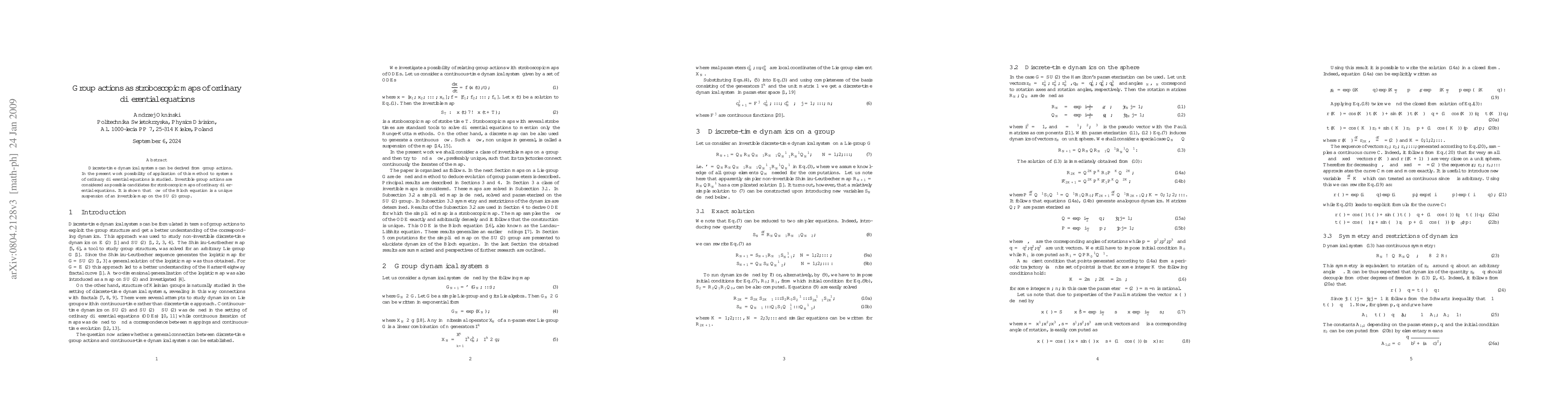 This paper explores how group actions can serve as stroboscopic maps for systems of ordinary differential equations, specifically demonstrating that the flow of the Bloch equation corresponds to a unique suspension of an invertible map on the SU(2) group.