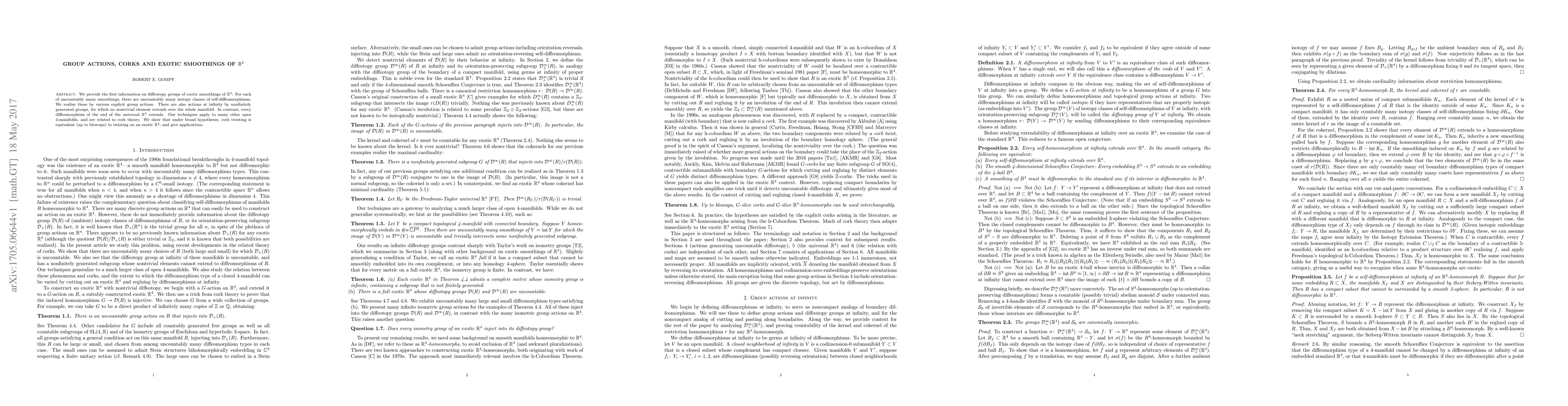 This paper explores the diffeotopy groups of exotic smoothings of R^4, revealing uncountably many isotopy classes of self-diffeomorphisms for each smoothing. It also discusses group actions at infinity and their implications, linking these findings to cork theory and applications in open 4-manifolds.