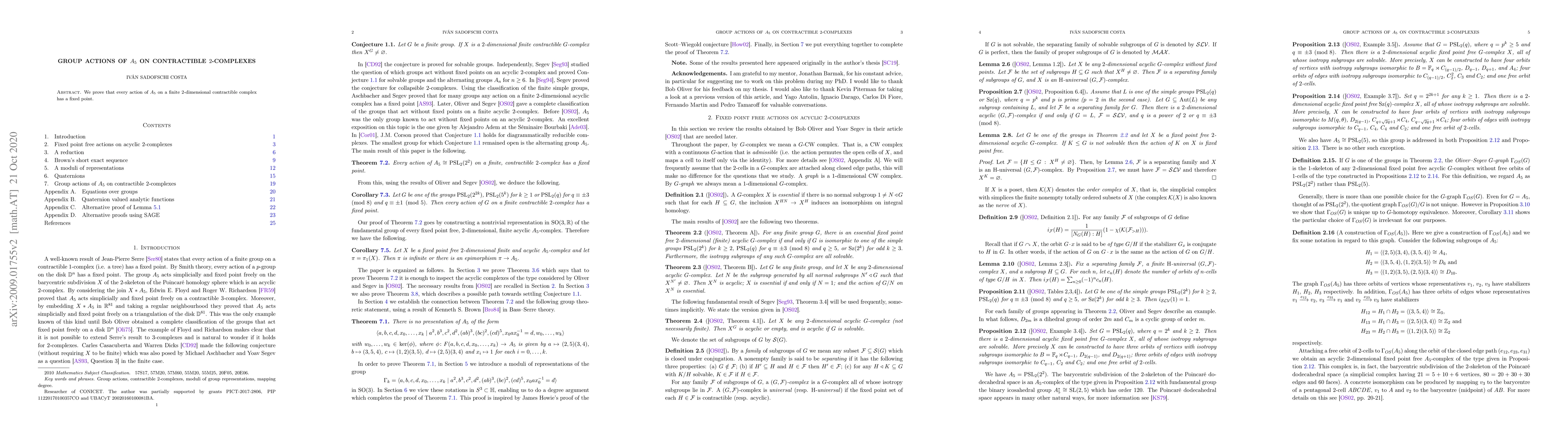 We prove that every action of $A_5$ on a finite $2$-dimensional contractible complex has a fixed point.