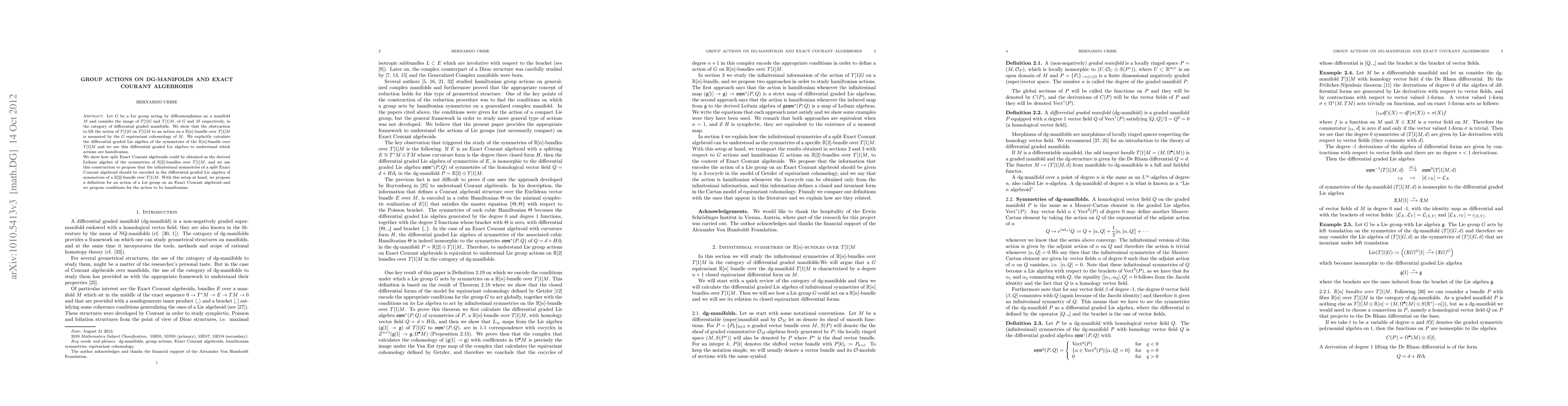 Let G be a Lie group acting by diffeomorphisms on a manifold M and consider the image of T[1]G and T[1]M, of G and M respectively, in the category of differential graded manifolds. We show that the obstruction to lift the action of T[1]G on T[1]M to an action on a R[n]-bundle over T[1]M is measured by the G equivariant cohomology of M. We explicitly calculate the differential graded Lie algebra of the symmetries of the R[n]-bundle over T[1]M and we use this differential graded Lie algebra to understand which actions are hamiltonian. We show how split Exact Courant algebroids could be obtained as the derived Leibniz algebra of the symmetries of R[2]-bundles over T[1]M, and we use this construction to propose that the infinitesimal symmetries of a split Exact Courant algebroid should be encoded in the differential graded Lie algebra of symmetries of a R[2]-bundle over T[1]M. With this setup at hand, we propose a definition for an action of a Lie group on an Exact Courant algebroid and we propose conditions for the action to be hamiltonian.