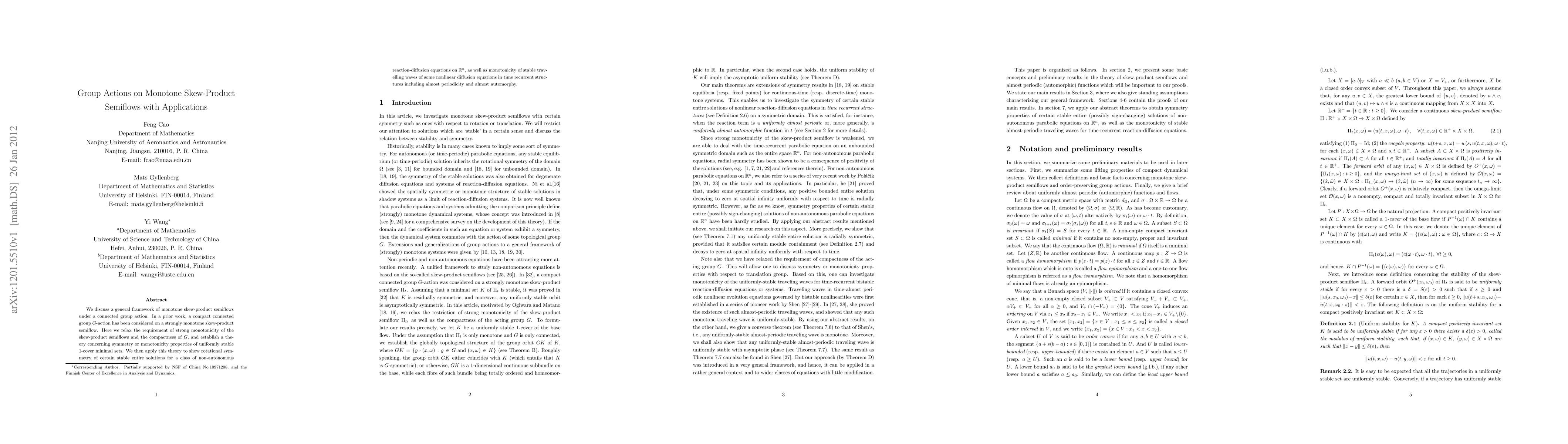 This paper develops a framework for analyzing monotone skew-product semiflows under group actions, leading to insights on rotational symmetry in stable solutions and monotonicity of stable travelling waves in certain nonlinear equations.