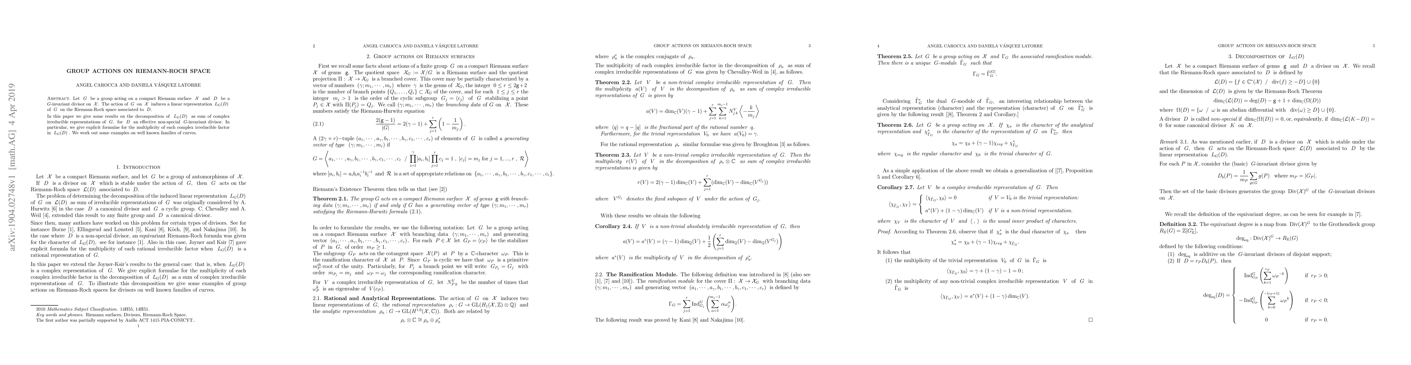 Let $ \; G \; $ be a group acting on a compact Riemann surface $ \; {\mathcal X} \; $ and $ \; D \; $ be a $ \; G$-invariant divisor on $\; {\mathcal X}. \; $ The action of $ \; G \; $ on $ \; {\mathcal X} \; $ induces a linear representation $ \; L_G(D) \; $ of $ \; G \; $ on the Riemann-Roch space associated to $ \; D.$ In this paper we give some results on the decomposition of $ \; L_G(D) \; $ as sum of complex irreducible representations of $ \; G, \; $ for $ \; D \; $ an effective non-special $\; G$-invariant divisor. In particular, we give explicit formulae for the multiplicity of each complex irreducible factor in $ \; L_G(D) \; $. We work out some examples on well known families of curves.