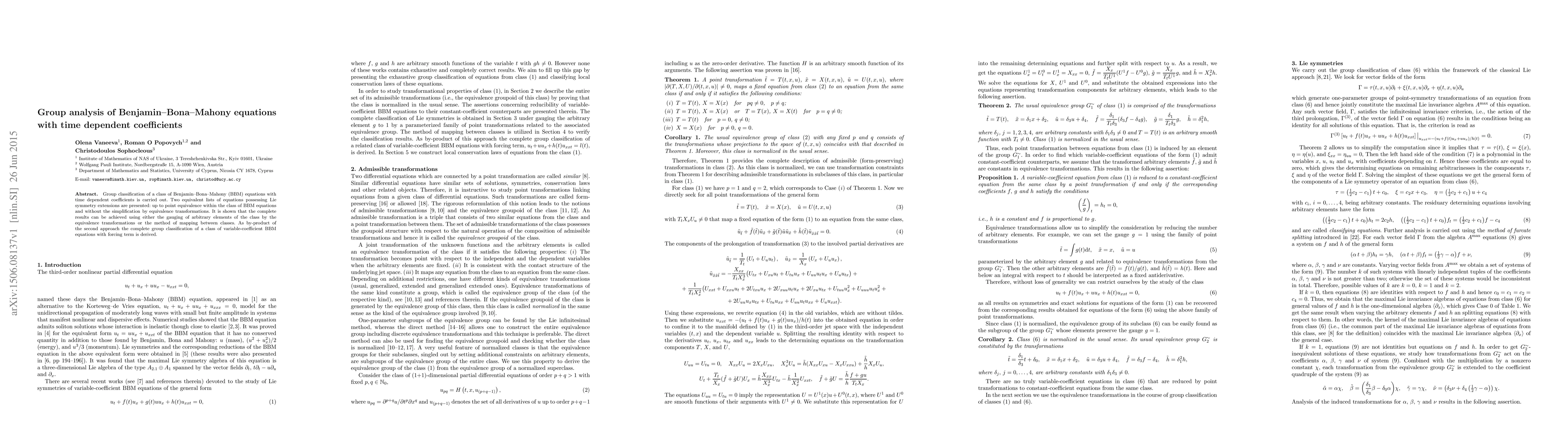 This paper conducts a group classification of Benjamin-Bona-Mahony (BBM) equations with time-dependent coefficients, presenting two lists of equivalent equations with Lie symmetry extensions. The study demonstrates that complete classification results can be obtained through either gauging or mapping methods, also yielding a complete classification of variable-coefficient BBM equations with a forcing term as a by-product.