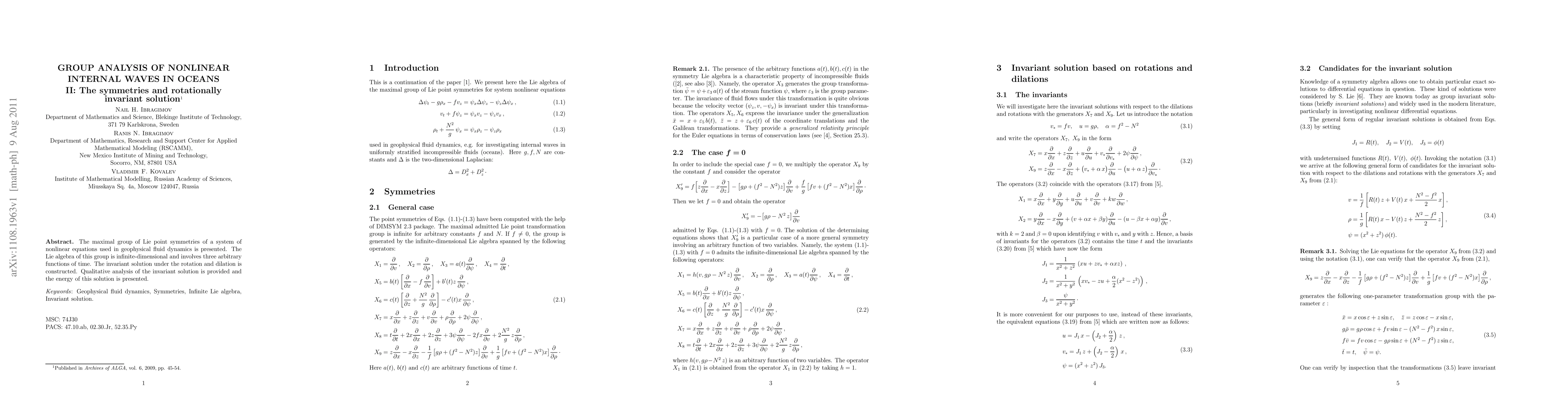 74J30The maximal group of Lie point symmetries of a system of nonlinear equations used in geophysical fluid dynamics is presented. The Lie algebra of this group is infinite-dimensional and involves three arbitrary functions of time. The invariant solution under the rotation and dilation is constructed. Qualitative analysis of the invariant solution is provided and the energy of this solution is presented.