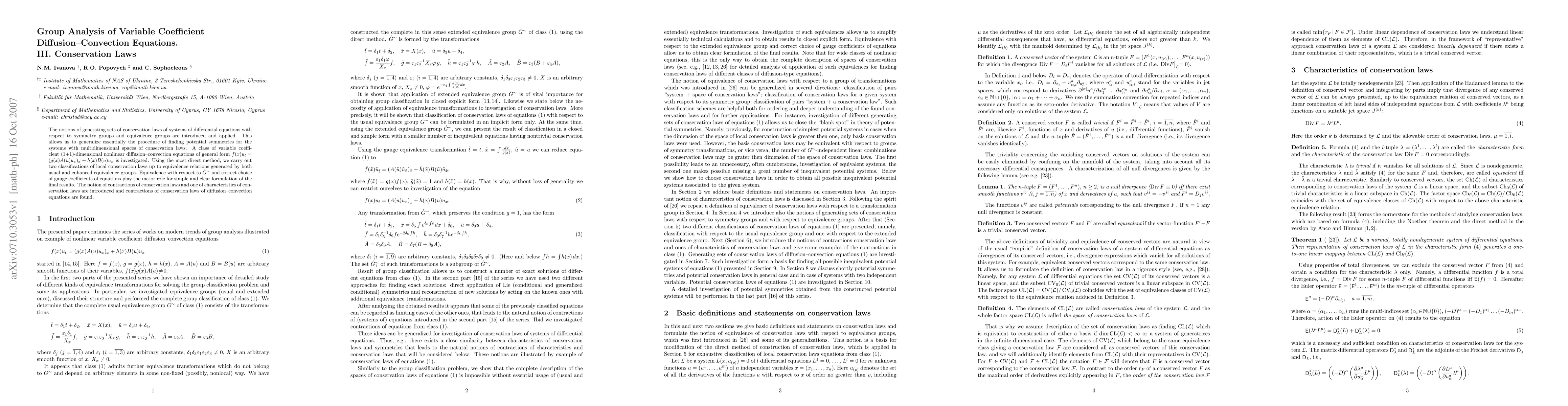 The notions of generating sets of conservation laws of systems of differential equations with respect to symmetry groups and equivalence groups are introduced and applied. This allows us to generalize essentially the procedure of finding potential symmetries for the systems with multidimensional spaces of conservation laws. A class of variable coefficient (1+1)-dimensional nonlinear diffusion-convection equations of general form $f(x)u_t=(g(x)A(u)u_x)_x+h(x)B(u)u_x$ is investigated. Using the most direct method, we carry out two classifications of local conservation laws up to equivalence relations generated by both usual and enhanced equivalence groups. Equivalence with respect to $\hat G^{\sim}$ and correct choice of gauge coefficients of equations play the major role for simple and clear formulation of the final results. The notion of contractions of conservation laws and one of characteristics of conservation laws are introduced and contractions of conservation laws of diffusion-convection equations are found.