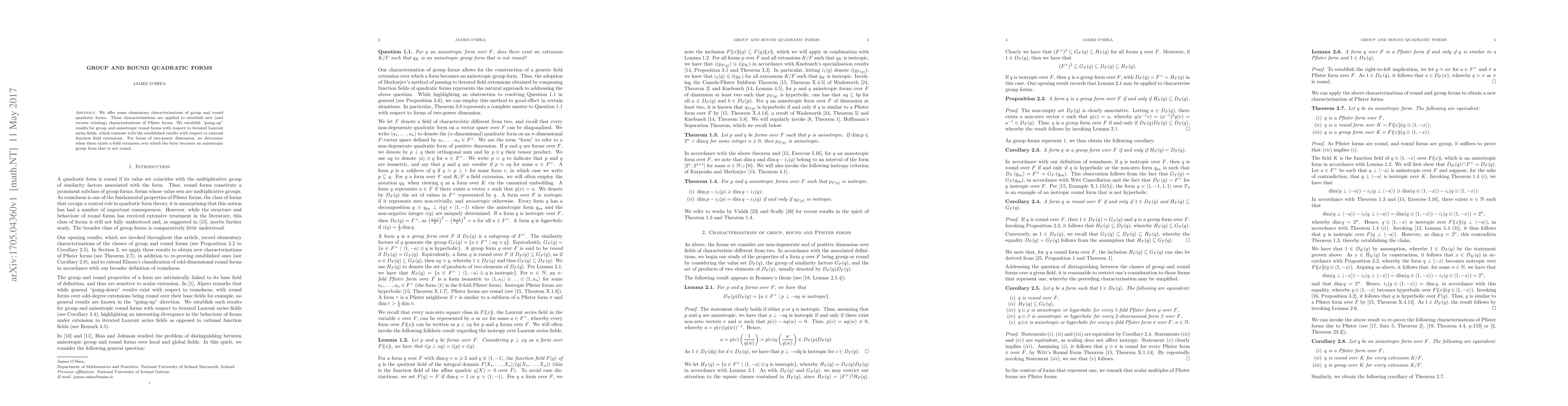 We offer some elementary characterisations of group and round quadratic forms. These characterisations are applied to establish new (and recover existing) characterisations of Pfister forms. We establish "going-up" results for group and anisotropic round forms with respect to iterated Laurent series fields, which contrast with the established results with respect to rational function field extensions. For forms of two-power dimension, we determine when there exists a field extension over which the form becomes an anisotropic group form that is not round.
