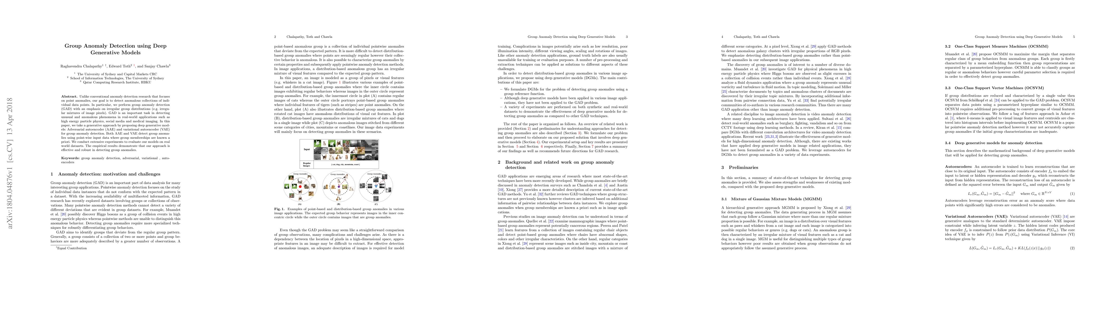 This research proposes deep generative models, specifically Adversarial autoencoder (AAE) and variational autoencoder (VAE), for detecting anomalous collections of data points in groups. Extensive experiments on real-world datasets show that these models are effective and robust in identifying irregular group distributions, which is crucial for applications in high energy physics, social media, and medical imaging.
