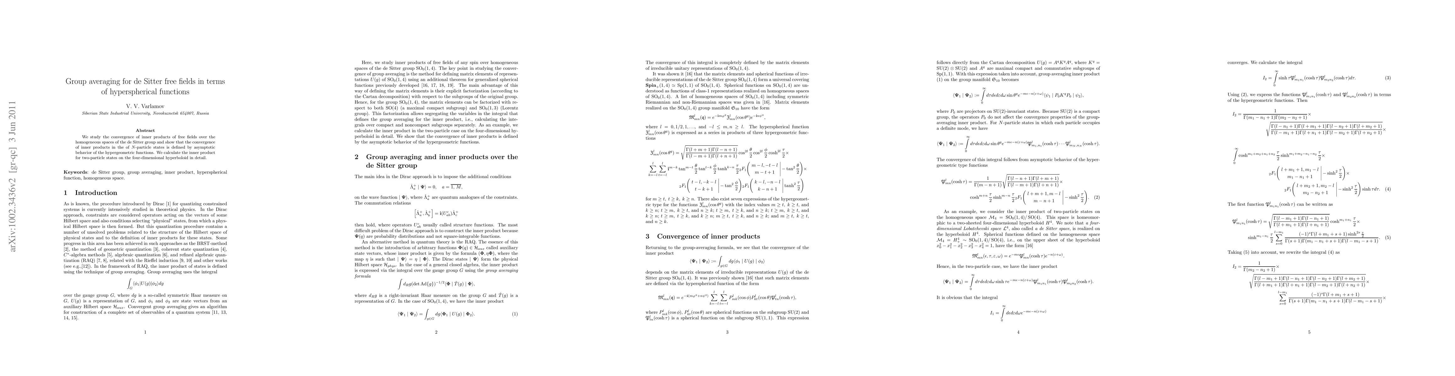 This paper investigates the convergence of inner products for de Sitter free fields over homogeneous spaces, focusing on the asymptotic behavior of hypergeometric functions. It provides a detailed calculation of the inner product for two-particle states on a four-dimensional hyperboloid.