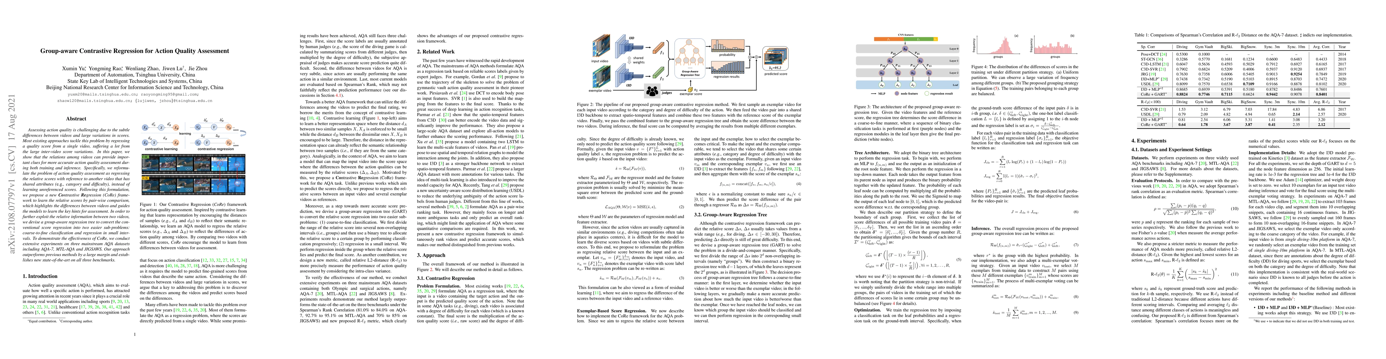 This paper proposes a Contrastive Regression (CoRe) framework for action quality assessment, which leverages relative scores between videos sharing attributes to improve accuracy. The group-aware regression tree simplifies the problem into coarse-to-fine classification and interval regression, leading to significant performance gains over previous methods on three datasets.