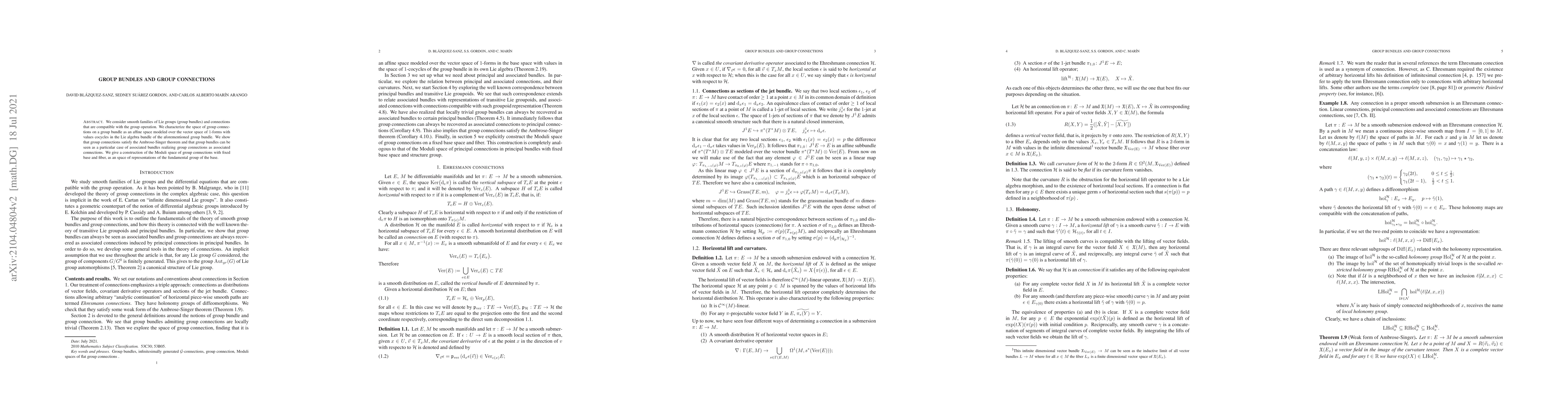 This paper studies smooth families of Lie groups and connections compatible with group operations, characterizing group connections as an affine space over a vector space of 1-forms. It shows group connections satisfy the Ambrose-Singer theorem and constructs the Moduli space of these connections as a space of representations of the base's fundamental group.
