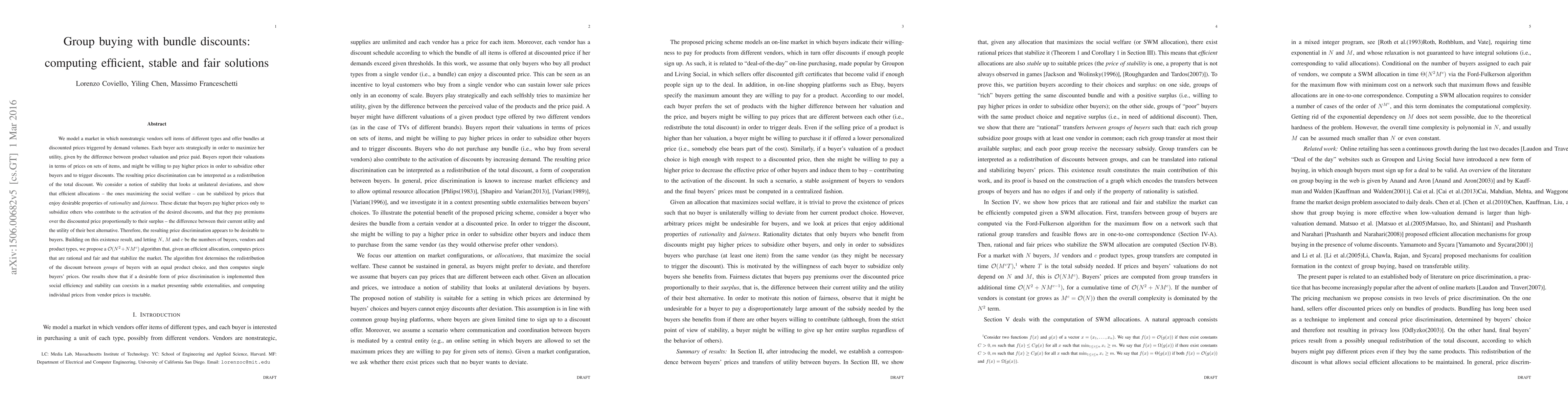 We model a market in which nonstrategic vendors sell items of different types and offer bundles at discounted prices triggered by demand volumes. Each buyer acts strategically in order to maximize her utility, given by the difference between product valuation and price paid. Buyers report their valuations in terms of reserve prices on sets of items, and might be willing to pay prices different than the market price in order to subsidize other buyers and to trigger discounts. The resulting price discrimination can be interpreted as a redistribution of the total discount. We consider a notion of stability that looks at unilateral deviations, and show that efficient allocations - the ones maximizing the social welfare - can be stabilized by prices that enjoy desirable properties of rationality and fairness. These dictate that buyers pay higher prices only to subsidize others who contribute to the activation of the desired discounts, and that they pay premiums over the discounted price proportionally to their surplus - the difference between their current utility and the utility of their best alternative. Therefore, the resulting price discrimination appears to be desirable to buyers. Building on this existence result, and letting N, M and c be the numbers of buyers, vendors and product types, we propose a O(N^2+NM^c) algorithm that, given an efficient allocation, computes prices that are rational and fair and that stabilize the market. The algorithm first determines the redistribution of the discount between groups of buyers with an equal product choice, and then computes single buyers' prices. Our results show that if a desirable form of price discrimination is implemented then social efficiency and stability can coexists in a market presenting subtle externalities, and computing individual prices from market prices is tractable.