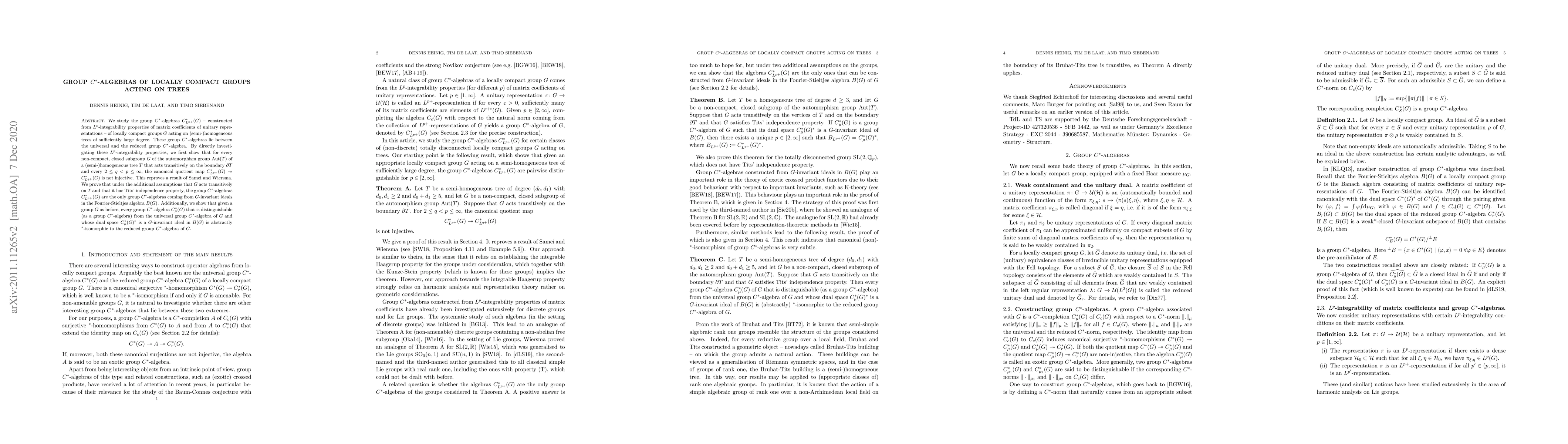We study the group $C^*$-algebras $C^*_{L^{p+}}(G)$ - constructed from $L^p$-integrability properties of matrix coefficients of unitary representations - of locally compact groups $G$ acting on (semi-)homogeneous trees of sufficiently large degree. These group $C^*$-algebras lie between the universal and the reduced group $C^*$-algebra. By directly investigating these $L^p$-integrability properties, we first show that for every non-compact, closed subgroup $G$ of the automorphism group $\mathrm{Aut}(T)$ of a (semi-)homogeneous tree $T$ that acts transitively on the boundary $\partial T$ and every $2 \leq q < p \leq \infty$, the canonical quotient map $C^*_{L^{p+}}(G) \twoheadrightarrow C^*_{L^{q+}}(G)$ is not injective. This reproves a result of Samei and Wiersma. We prove that under the additional assumptions that $G$ acts transitively on $T$ and that it has Tits' independence property, the group $C^*$-algebras $C^*_{L^{p+}}(G)$ are the only group $C^*$-algebras coming from $G$-invariant ideals in the Fourier-Stieltjes algebra $B(G)$. Additionally, we show that given a group $G$ as before, every group $C^*$-algebra $C^*_{\mu}(G)$ that is distinguishable (as a group $C^*$-algebra) from the universal group $C^*$-algebra of $G$ and whose dual space $C^*_\mu(G)^*$ is a $G$-invariant ideal in $B(G)$ is abstractly ${}^*$-isomorphic to the reduced group $C^*$-algebra of $G$.
