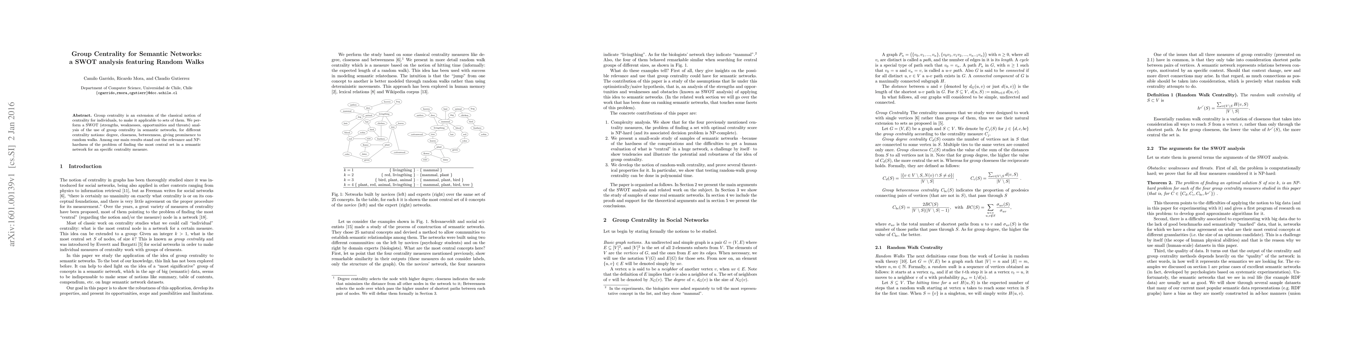 Group centrality is an extension of the classical notion of centrality for individuals, to make it applicable to sets of them. We perform a SWOT (strengths, weaknesses, opportunities and threats) analysis of the use of group centrality in semantic networks, for different centrality notions: degree, closeness, betweenness, giving prominence to random walks. Among our main results stand out the relevance and NP-hardness of the problem of finding the most central set in a semantic network for an specific centrality measure.