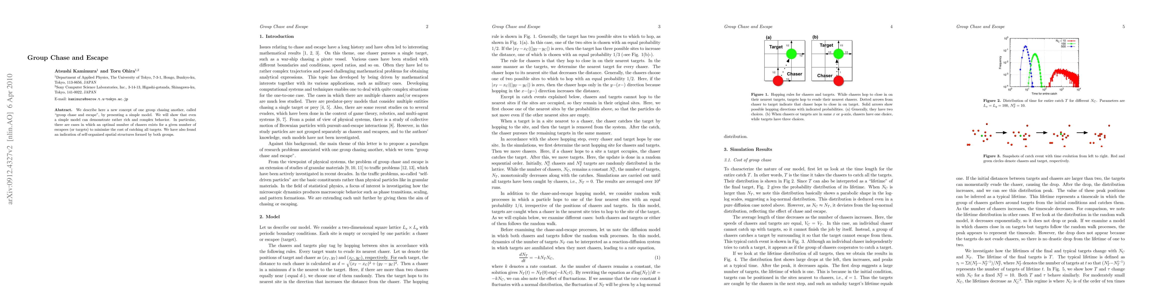 We describe here a new concept of one group chasing another, called "group chase and escape", by presenting a simple model. We will show that even a simple model can demonstrate rather rich and complex behavior. In particular, there are cases in which an optimal number of chasers exists for a given number of escapees (or targets) to minimize the cost of catching all targets. We have also found an indication of self-organized spatial structures formed by both groups.