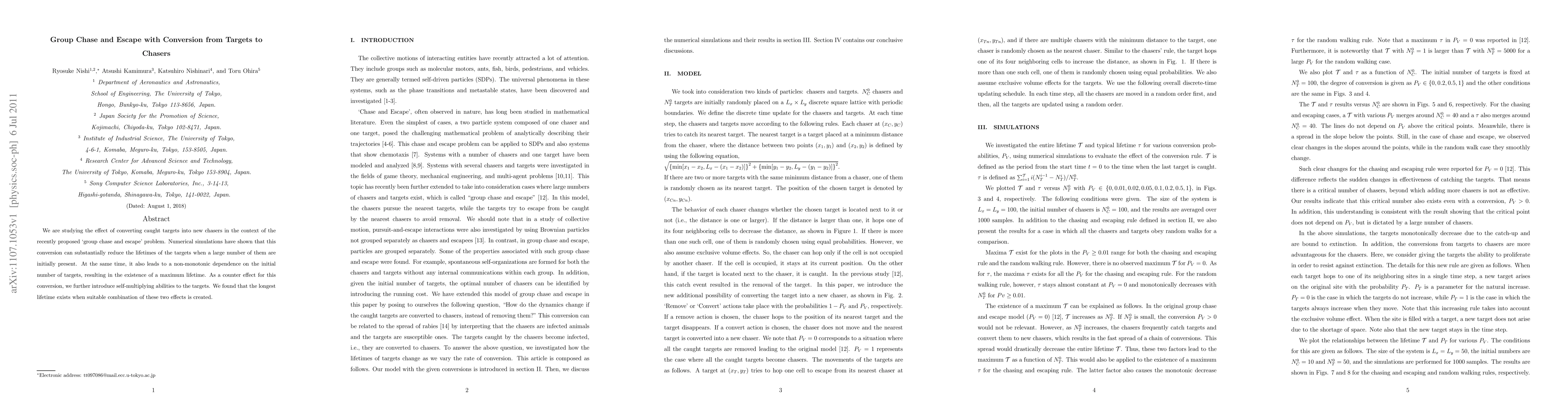 We are studying the effect of converting caught targets into new chasers in the context of the recently proposed `group chase and escape' problem. Numerical simulations have shown that this conversion can substantially reduce the lifetimes of the targets when a large number of them are initially present. At the same time, it also leads to a non-monotonic dependence on the initial number of targets, resulting in the existence of a maximum lifetime. As a counter effect for this conversion, we further introduce self-multiplying abilities to the targets. We found that the longest lifetime exists when suitable combination of these two effects is created.