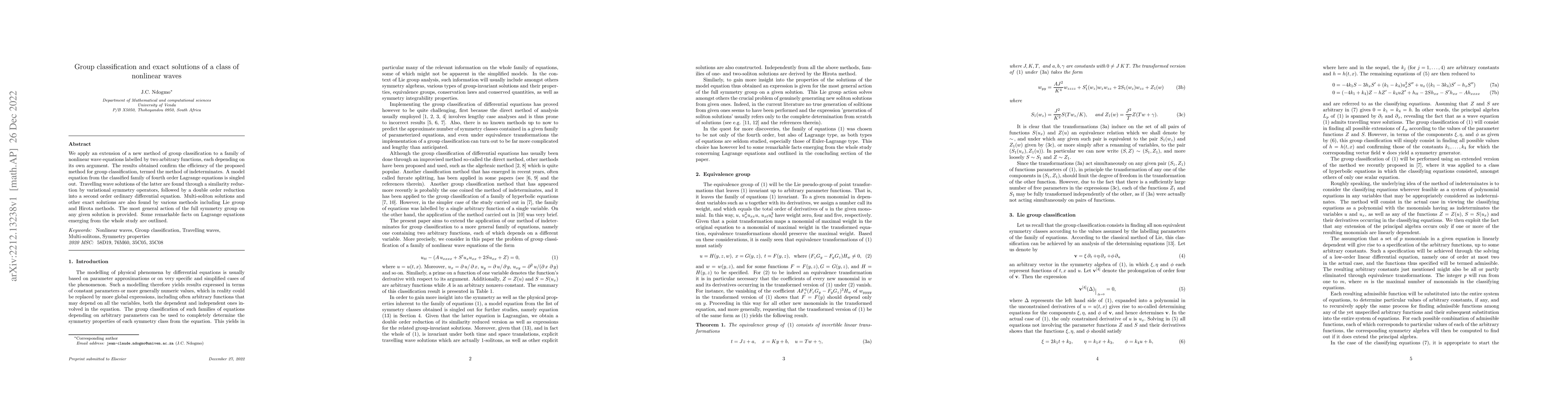 This paper applies a new group classification method to a family of nonlinear wave equations, confirming its efficiency. It identifies exact solutions, including multi-soliton solutions, for a specific fourth-order Lagrange equation using similarity reduction and variational symmetry operators.