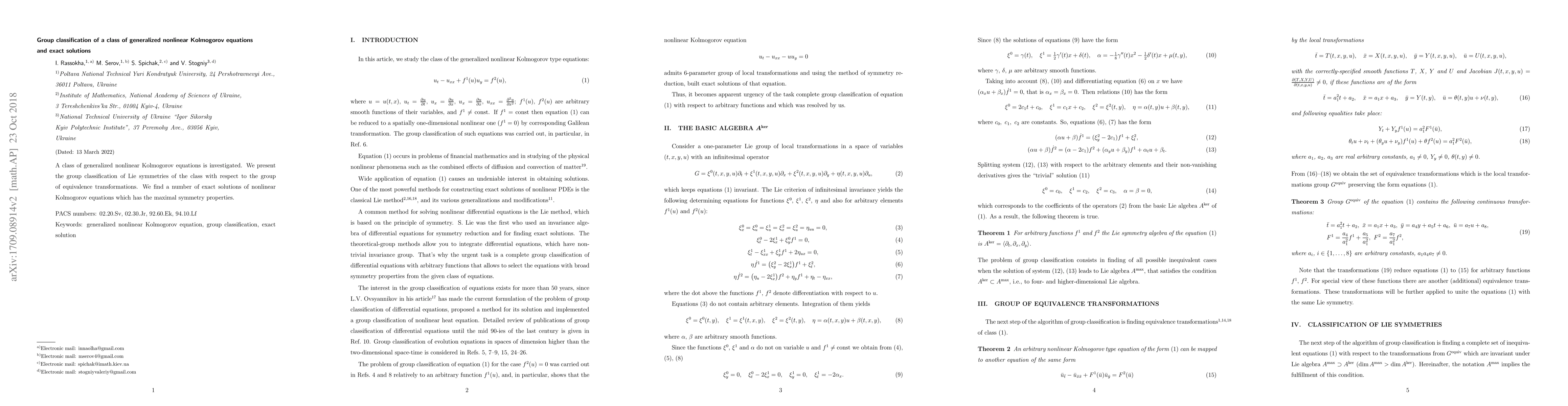 This paper explores the group classification of a class of generalized nonlinear Kolmogorov equations, identifying their Lie symmetries and finding exact solutions with maximal symmetry properties.