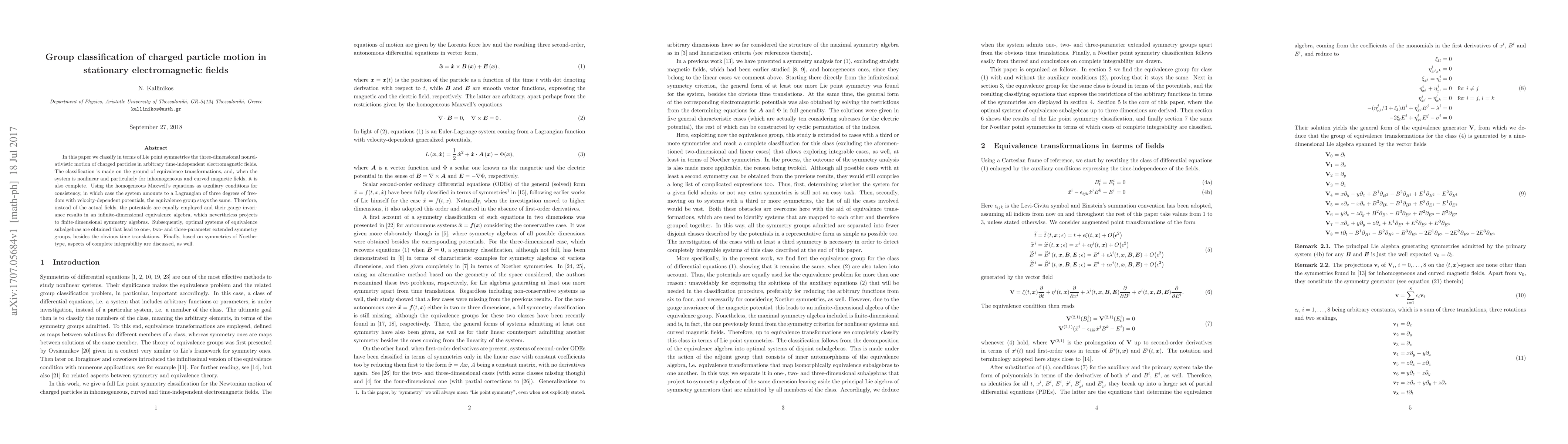 This paper classifies the three-dimensional motion of charged particles in stationary electromagnetic fields using Lie point symmetries and equivalence transformations, revealing infinite-dimensional equivalence algebras projecting to finite-dimensional symmetry algebras. It also explores aspects of complete integrability based on Noether symmetries.