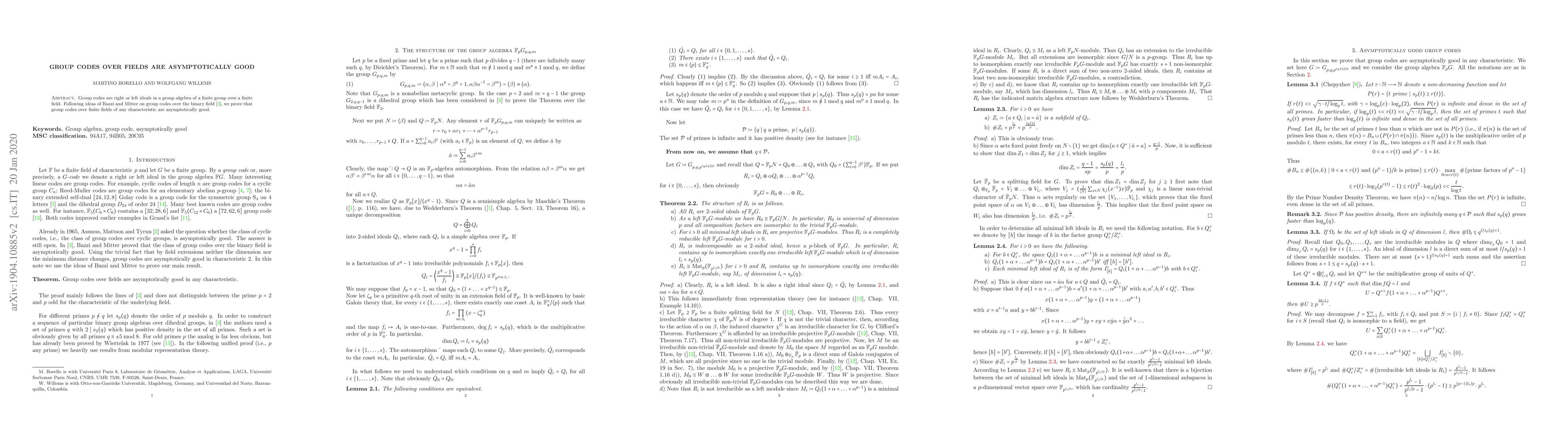 This paper proves that group codes, which are right or left ideals in a group algebra of a finite group over a finite field, are asymptotically good for any field characteristic. This extends previous results on group codes over binary fields.