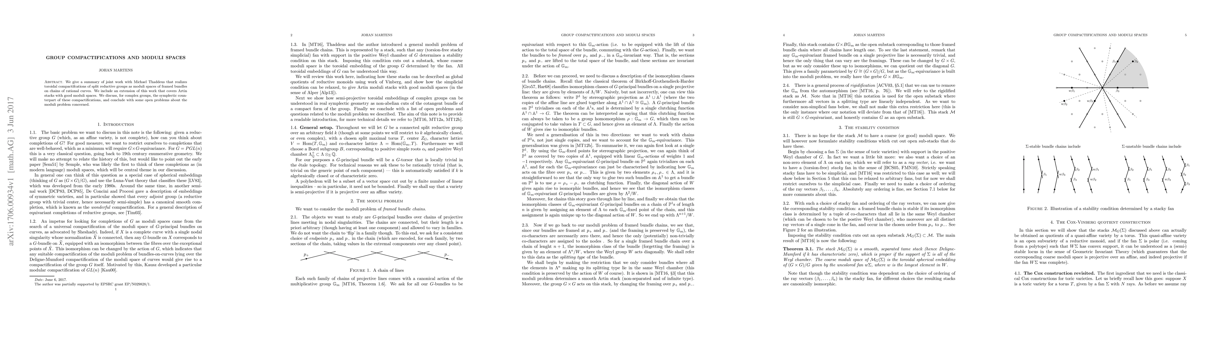 We give a summary of joint work with Michael Thaddeus that realizes toroidal compactifcations of split reductive groups as moduli spaces of framed bundles on chains of rational curves. We include an extension of this work that covers Artin stacks with good moduli spaces. We discuss, for complex groups, the symplectic counterpart of these compactifications, and conclude with some open problems about the moduli problem concerned.
