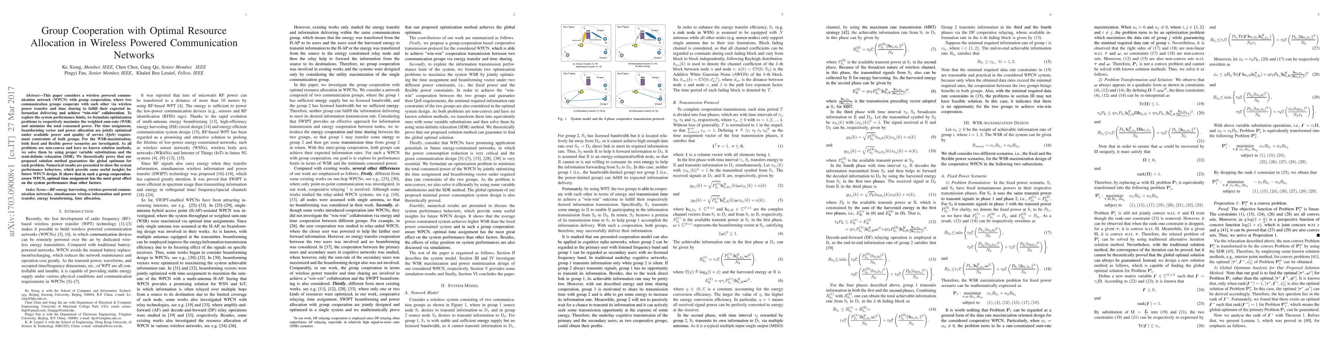 This paper optimizes resource allocation in wireless powered communication networks with group cooperation, focusing on maximizing weighted sum-rate and minimizing power consumption. It employs variable substitutions and semi-definite relaxation to solve non-convex optimization problems, proving global optimum solutions and highlighting the critical role of optimal time assignment in system performance.