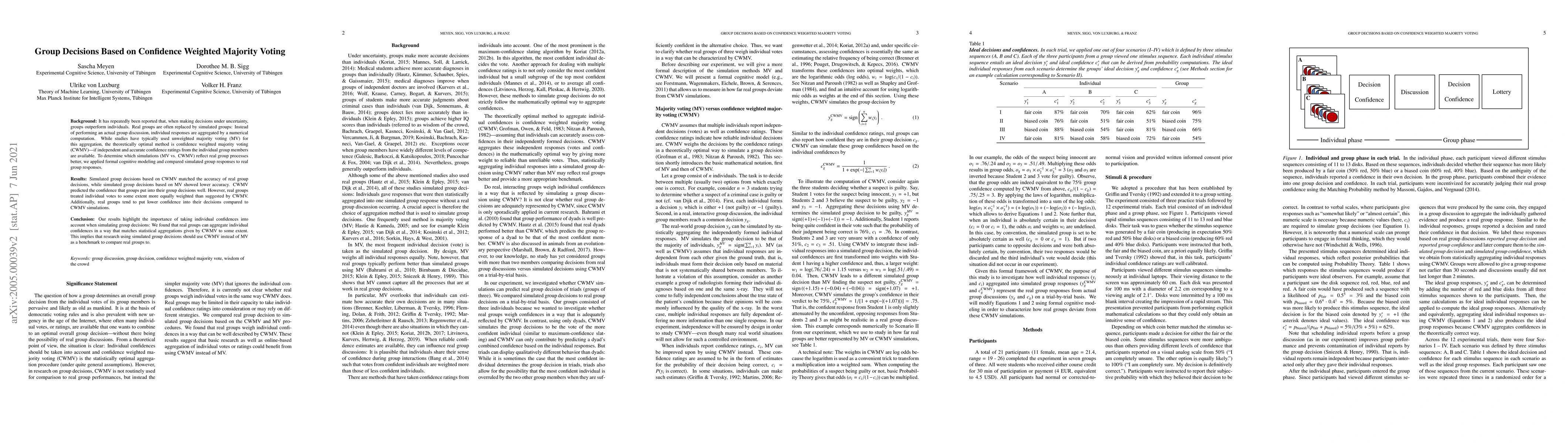 Simulated group decisions based on confidence weighted majority voting (CWMV) matched the accuracy of real group decisions, outperforming unweighted majority voting (MV), while also predicting individual confidences accurately.