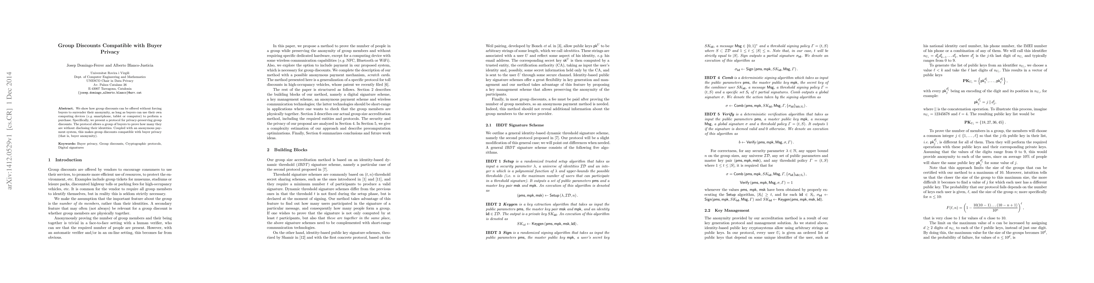 We show how group discounts can be offered without forcing buyers to surrender their anonymity, as long as buyers can use their own computing devices (e.g. smartphone, tablet or computer) to perform a purchase. Specifically, we present a protocol for privacy-preserving group discounts. The protocol allows a group of buyers to prove how many they are without disclosing their identities. Coupled with an anonymous payment system, this makes group discounts compatible with buyer privacy (that is, buyer anonymity).
