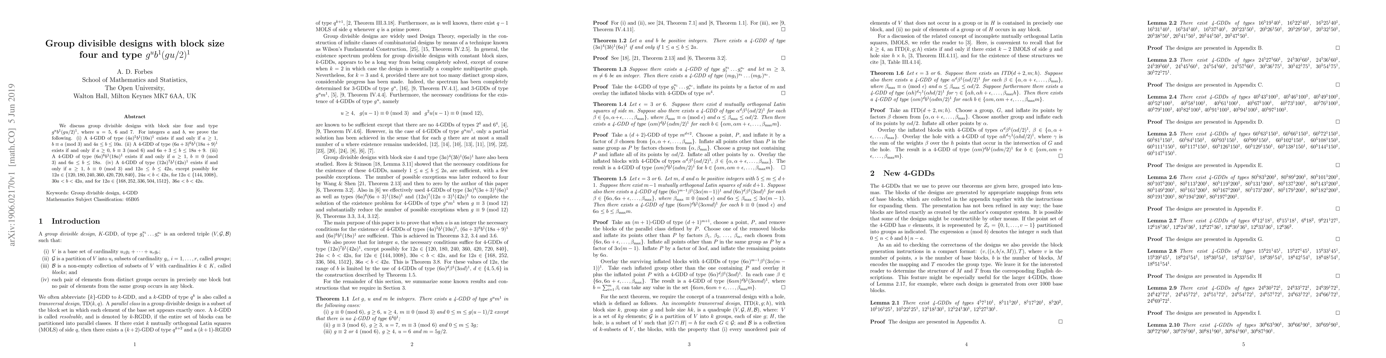 Researchers investigate group divisible designs with block size four for specific parameters, proving existence conditions based on integers $a$ and $b$, and highlighting exceptions for certain values of $a$. The findings provide insight into the construction of these designs under various constraints.