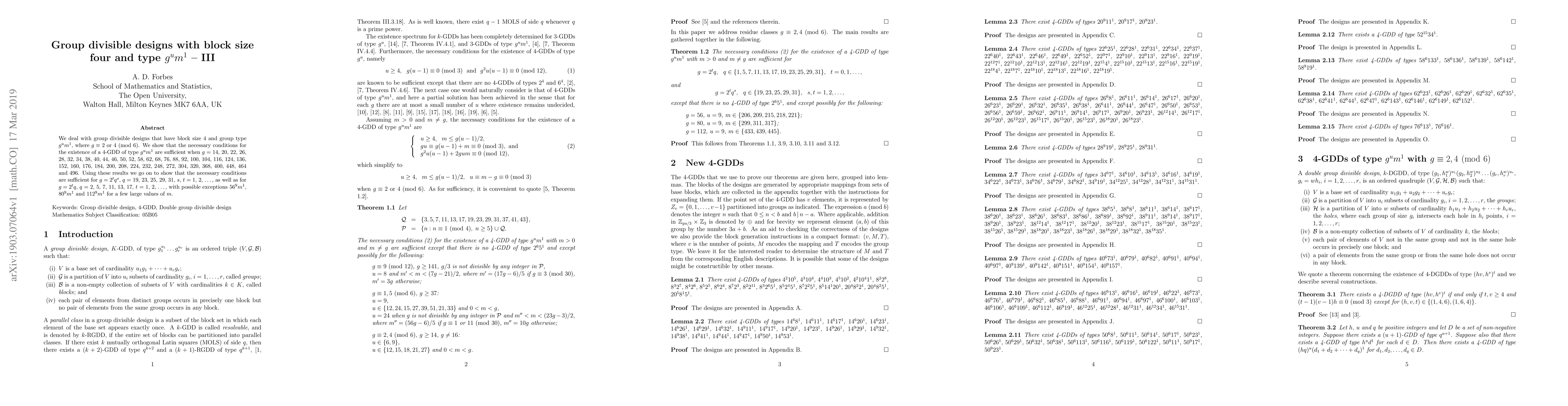 This research paper explores group divisible designs with block size 4 and type g^u m^1, finding necessary conditions for existence sufficient for specific values of g, q, and s, and providing implications for design construction.
