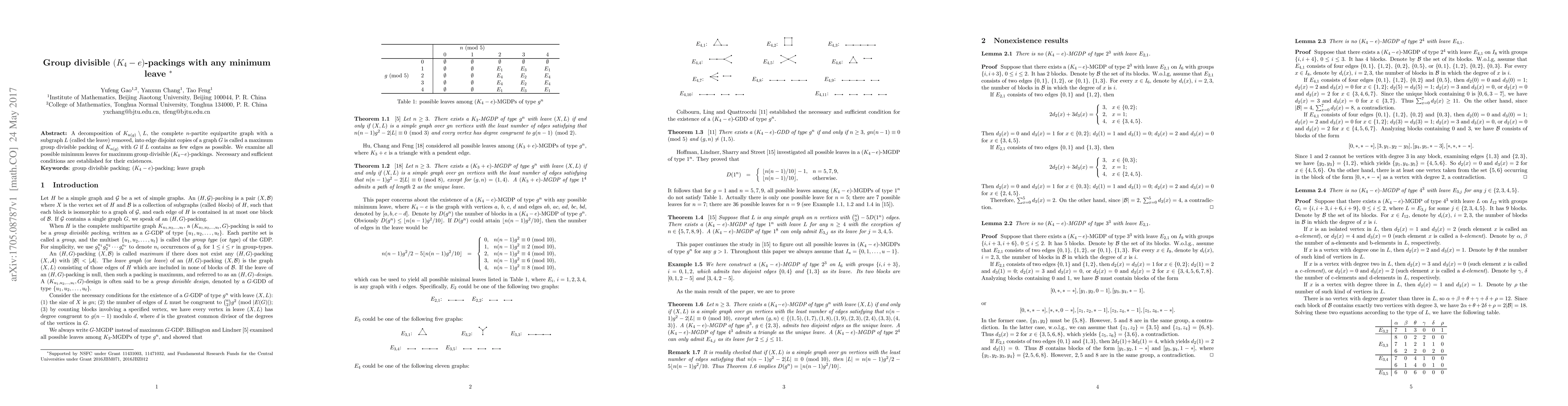A decomposition of $K_{n(g)}\setminus L$, the complete n-partite equipartite graph with a subgraph L (called the leave) removed, into edge disjoint copies of a graph G is called a maximum group divisible packing of $K_{n(g)}$ with G if L contains as few edges as possible. We examine all possible minimum leaves for maximum group divisible $(K_4-e)$-packings. Necessary and sufficient conditions are established for their existences.