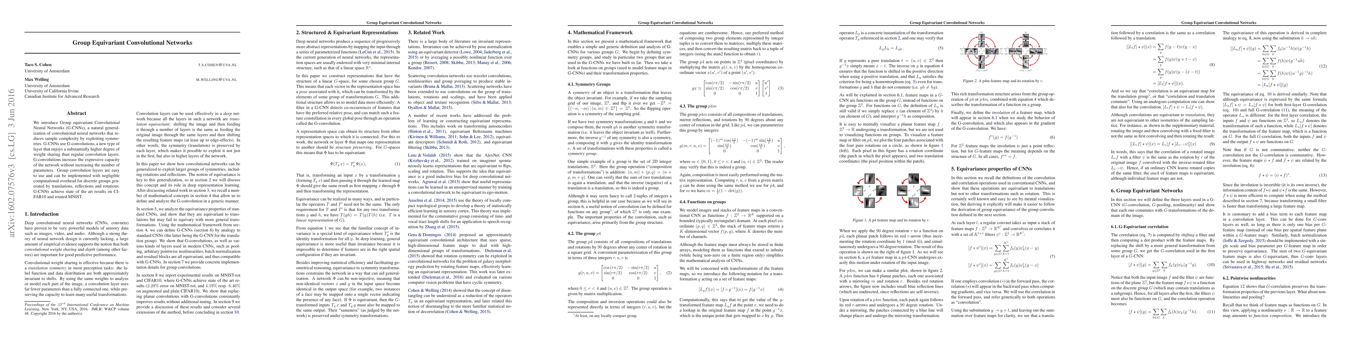 We introduce Group equivariant Convolutional Neural Networks (G-CNNs), a natural generalization of convolutional neural networks that reduces sample complexity by exploiting symmetries. G-CNNs use G-convolutions, a new type of layer that enjoys a substantially higher degree of weight sharing than regular convolution layers. G-convolutions increase the expressive capacity of the network without increasing the number of parameters. Group convolution layers are easy to use and can be implemented with negligible computational overhead for discrete groups generated by translations, reflections and rotations. G-CNNs achieve state of the art results on CIFAR10 and rotated MNIST.