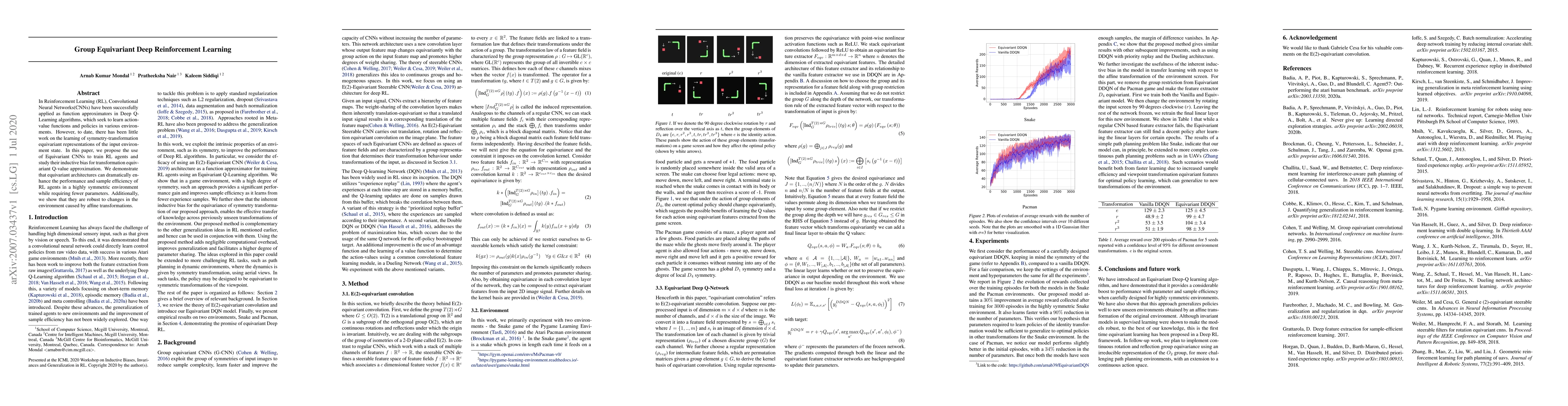 This paper introduces a new approach to deep reinforcement learning using equivariant convolutional neural networks, which improve performance and efficiency in symmetric environments.