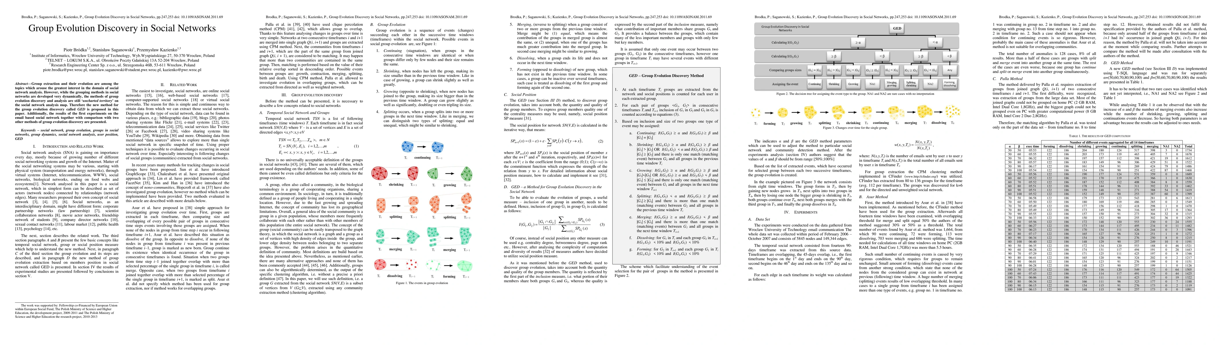 This paper proposes a new method, GED, for discovering and analyzing group evolution in social networks, addressing a currently underexplored area. The method is tested on an email-based social network and compared with two other existing group evolution discovery techniques.