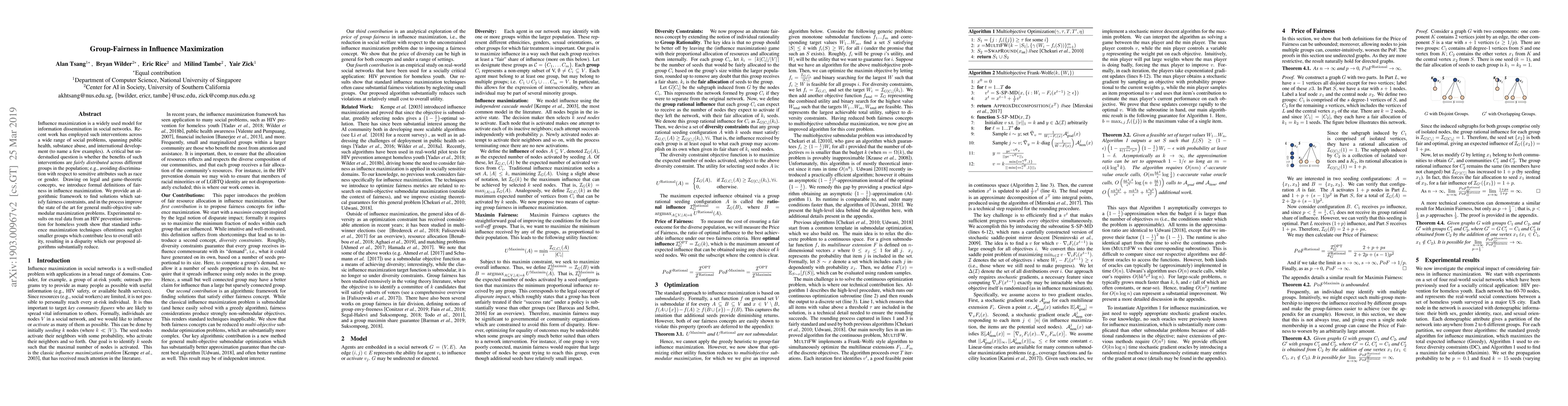 This paper introduces formal definitions of fairness in influence maximization to ensure equitable distribution of benefits across different population groups, proposing a new algorithmic framework to achieve this while improving general multi-objective submodular maximization. Experimental results demonstrate that standard techniques often neglect smaller groups, leading to disparities that the proposed algorithms significantly reduce.
