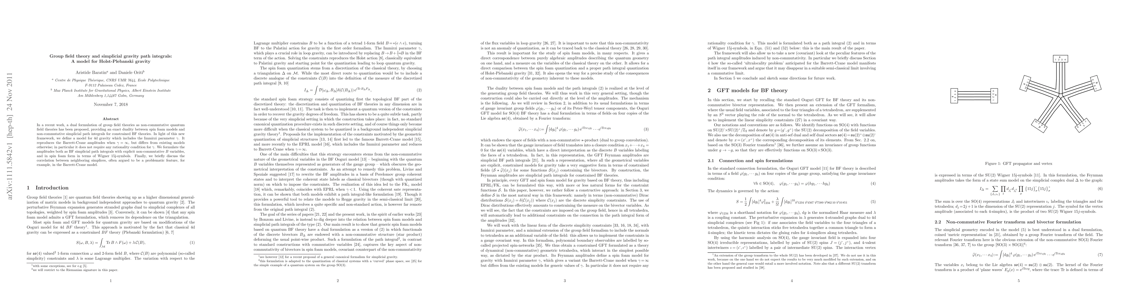 This paper proposes a new group field theory model for 4d gravity based on simplicial path integrals, which reproduces Barrett-Crane amplitudes in the limit of large Immirzi parameter gamma without requiring rationality conditions. It formulates these amplitudes in both BF simplicial and spin foam forms.