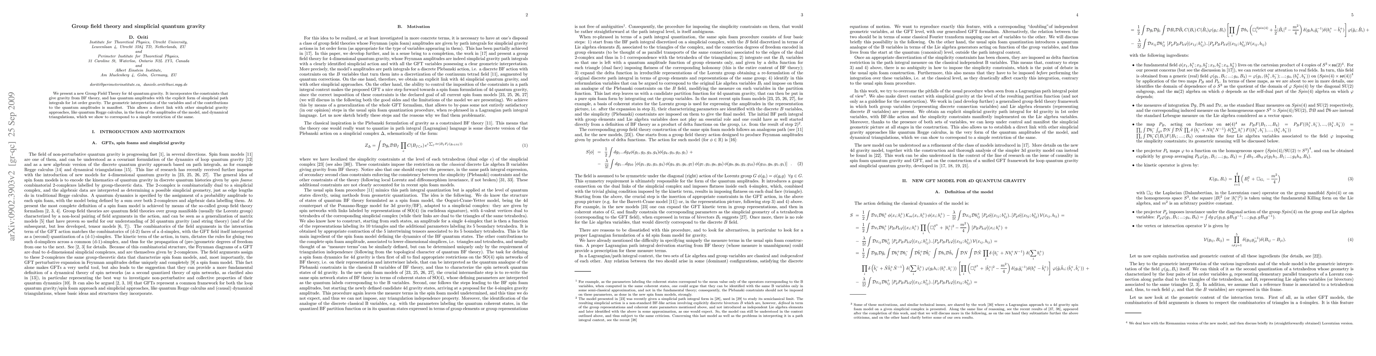 This paper introduces a novel Group Field Theory for 4d quantum gravity, incorporating BF theory constraints and providing quantum amplitudes structured as simplicial path integrals for 1st order gravity. It establishes a clear geometric interpretation and links directly with other simplicial gravity approaches.