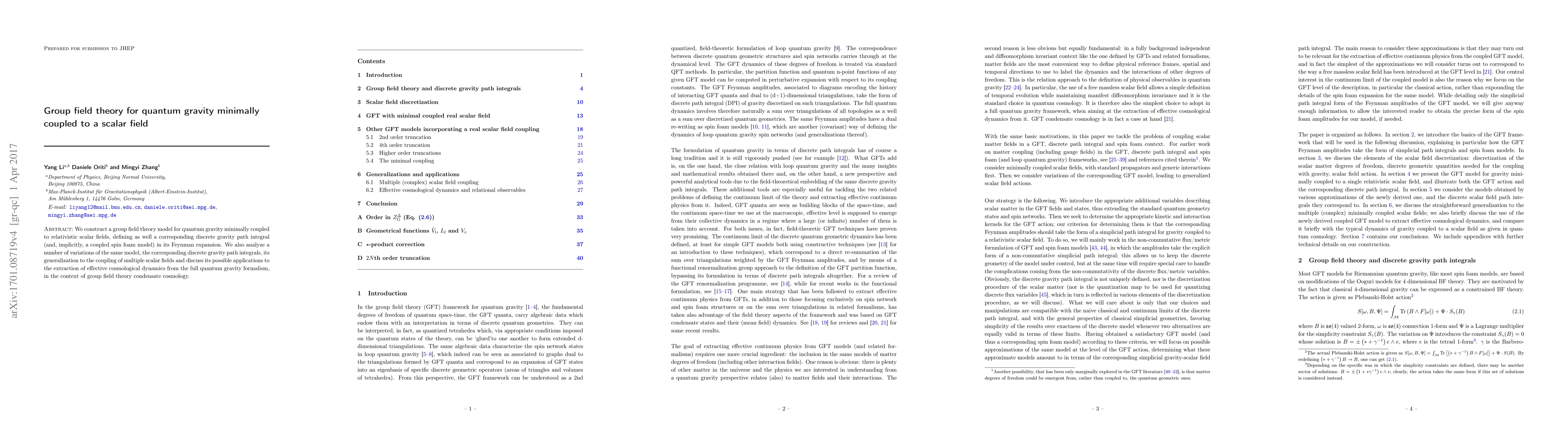 This paper constructs a group field theory model for quantum gravity coupled to scalar fields, defining a discrete gravity path integral and exploring variations and generalizations. It discusses potential applications to extracting effective cosmological dynamics within group field theory condensate cosmology.
