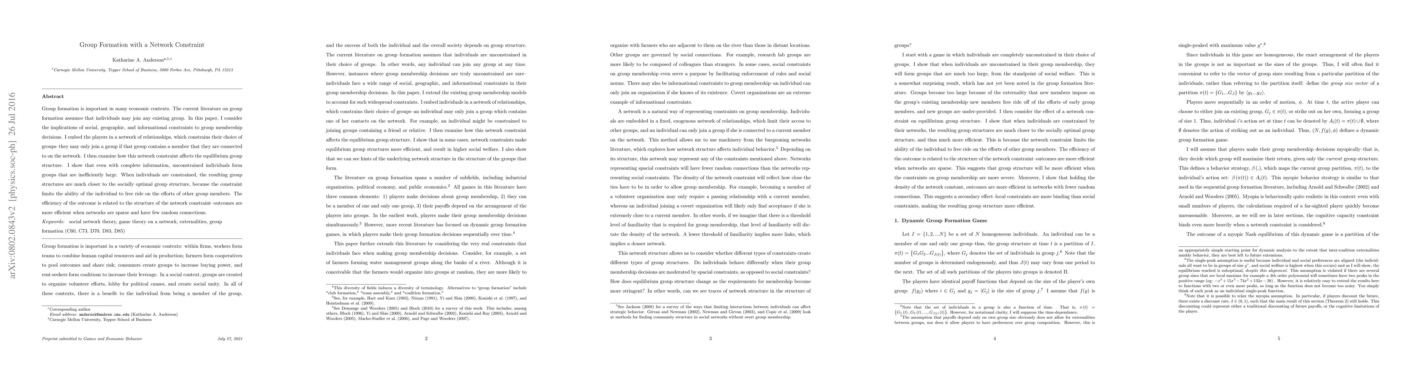 Group formation is important in many economic contexts. The current literature on group formation assumes that individuals may join any existing group. In this paper, I consider the implications of social, geographic, and informational constraints to group membership decisions. I embed the players in a network of relationships, which constrains their choice of groups--they may only join a group if that group contains a member that they are connected to on the network. I then examine how this network constraint affects the equilibrium group structure. I show that even with complete information, unconstrained individuals form groups that are inefficiently large. When individuals are constrained, the resulting group structures are much closer to the socially optimal group structure, because the constraint limits the ability of the individual to free ride on the efforts of other group members. The efficiency of the outcome is related to the structure of the network constraint--outcomes are more efficient when networks are sparse and have few random connections.