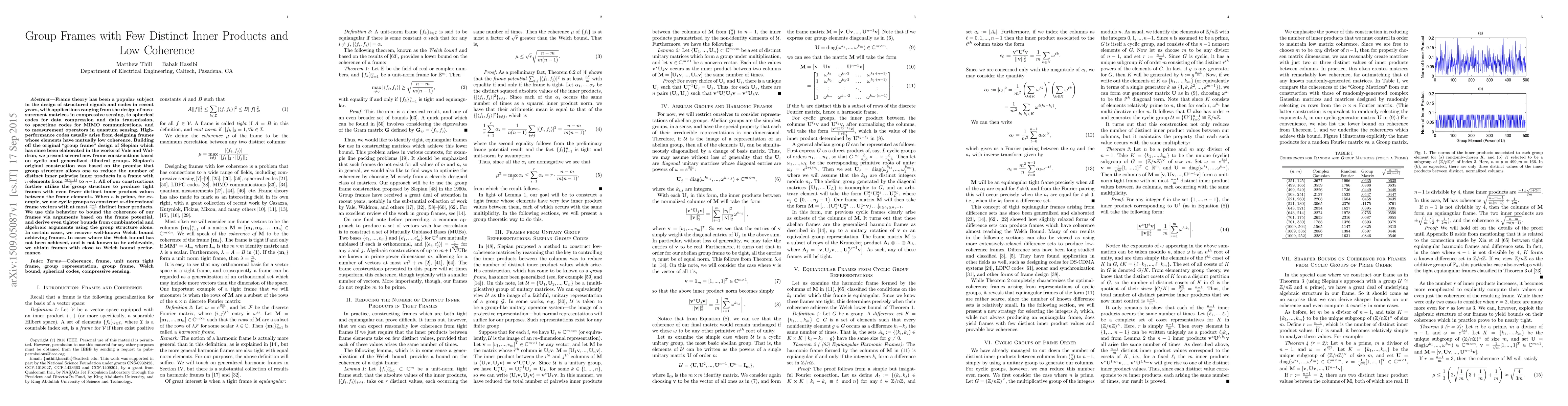 This paper presents new constructions of group frames based on cyclic and generalized dihedral groups that achieve low coherence and few distinct inner products, improving upon Slepian's original group frame design. The authors utilize group structure to minimize the number of distinct inner products and derive tight bounds on frame coherence, achieving near-optimal performance in many cases.