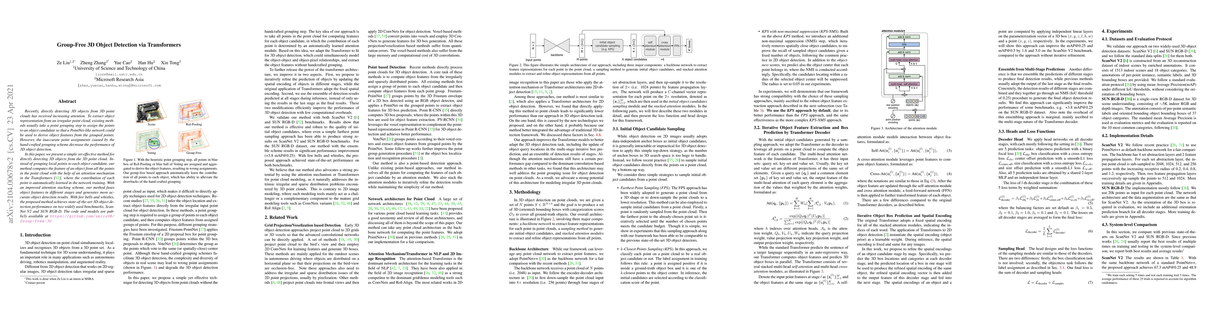 This paper proposes a group-free method for 3D object detection using a Transformer with attention mechanisms, eliminating the need for point grouping and thus improving detection accuracy. The method achieves state-of-the-art performance on ScanNet V2 and SUN RGB-D benchmarks.
