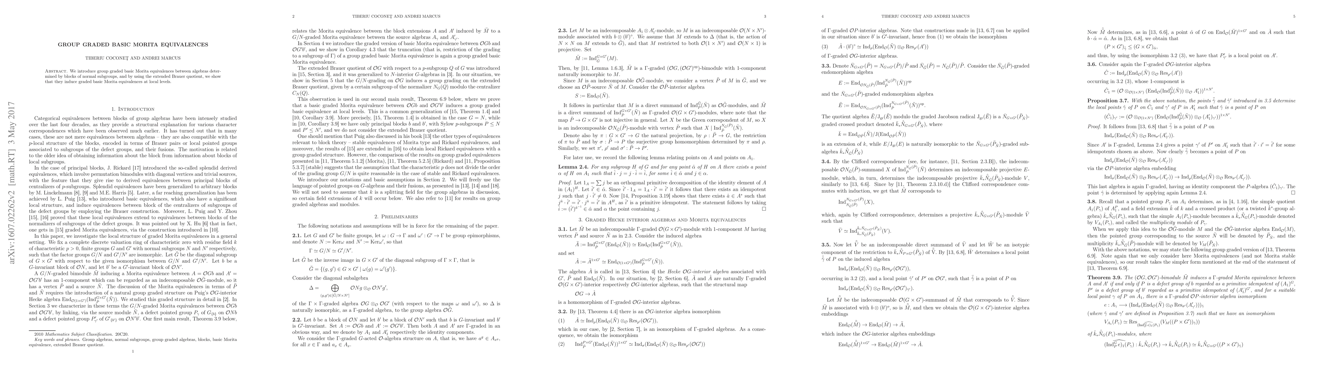 Summary: This paper introduces group graded basic Morita equivalences between algebras associated with blocks of normal subgroups, and demonstrates that these equivalences induce graded basic Morita equivalences using the extended Brauer quotient at local levels.