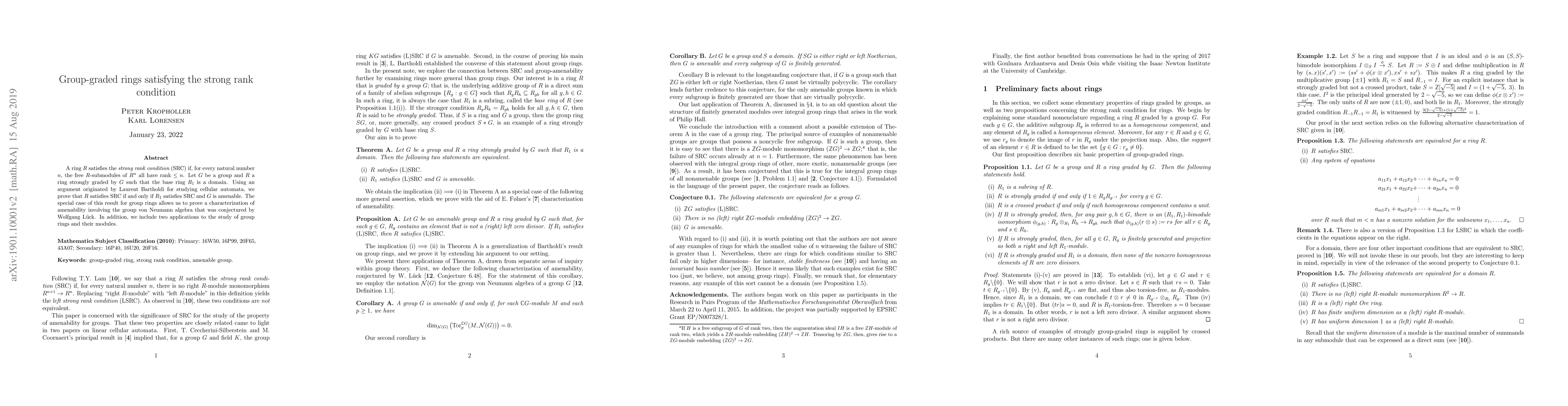 A ring $R$ satisfies the {\it strong rank condition} (SRC) if, for every natural number $n$, the free $R$-submodules of $R^n$ all have rank $\leq n$. Let $G$ be a group and $R$ a ring strongly graded by $G$ such that the base ring $R_1$ is a domain. Using an argument originated by Laurent Bartholdi for studying cellular automata, we prove that $R$ satisfies SRC if and only if $R_1$ satisfies SRC and $G$ is amenable. The special case of this result for group rings allows us to prove a characterization of amenability involving the group von Neumann algebra that was conjectured by Wolfgang L\"uck. In addition, we include two applications to the study of group rings and their modules.