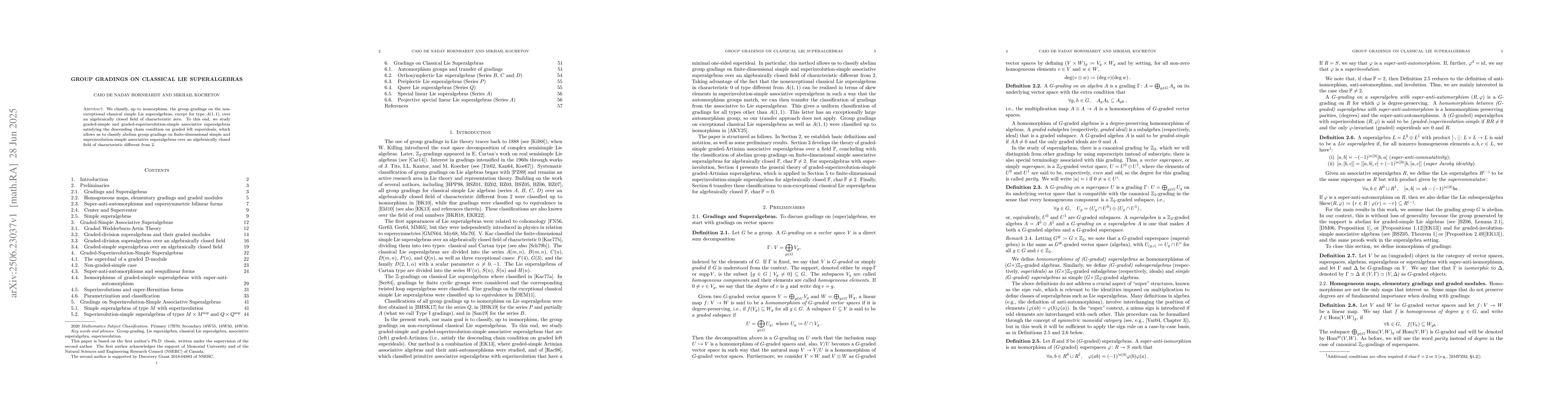 We classify, up to isomorphism, the group gradings on the non-exceptional classical simple Lie superalgebras, except for type A(1,1), over an algebraically closed field of characteristic zero. To this end, we study graded-simple and graded-superinvolution-simple associative superalgebras satisfying the descending chain condition on graded left superideals, which allows us to classify abelian group gradings on finite-dimensional simple and superinvolution-simple associative superalgebras over an algebraically closed field of characteristic different from 2.