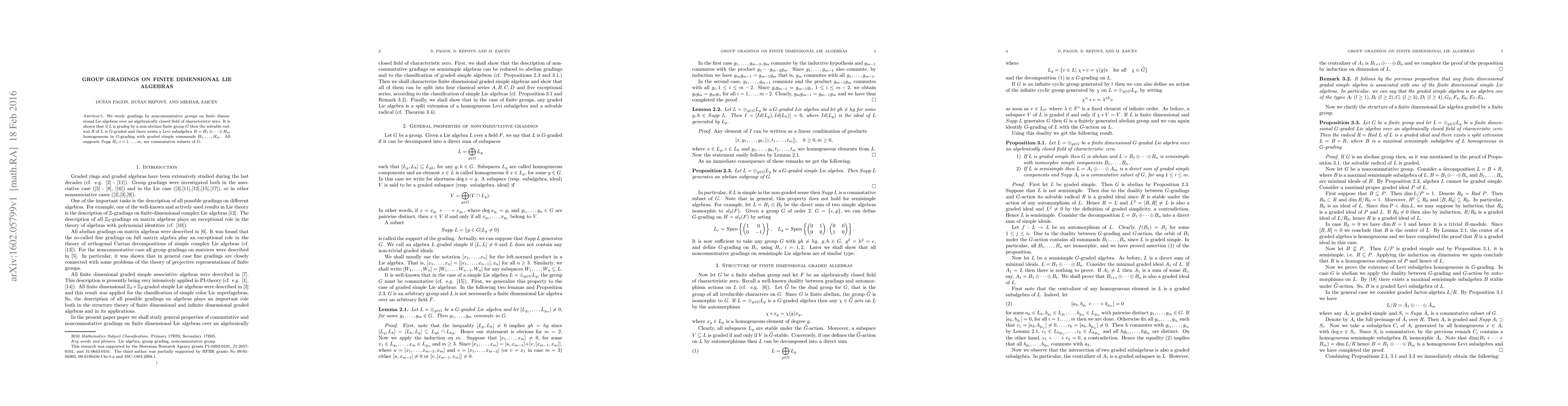 Summary: This paper investigates gradings of finite-dimensional Lie algebras by noncommutative groups, demonstrating that the solvable radical is graded and that a Levi subalgebra consists of graded simple summands with commutative support subsets.